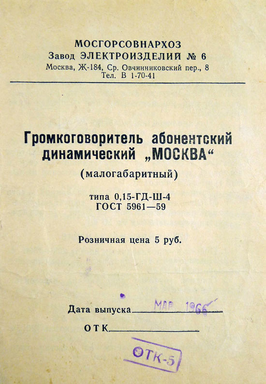 громкоговоритель "Москва" выпускал с 1966 года Московский завод электроаппаратуры.