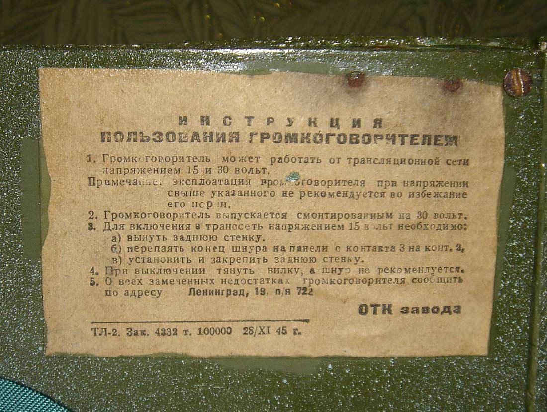 громкоговоритель "ПГР-3" с 1945 года выпускал Ленинградский союзный телефонный