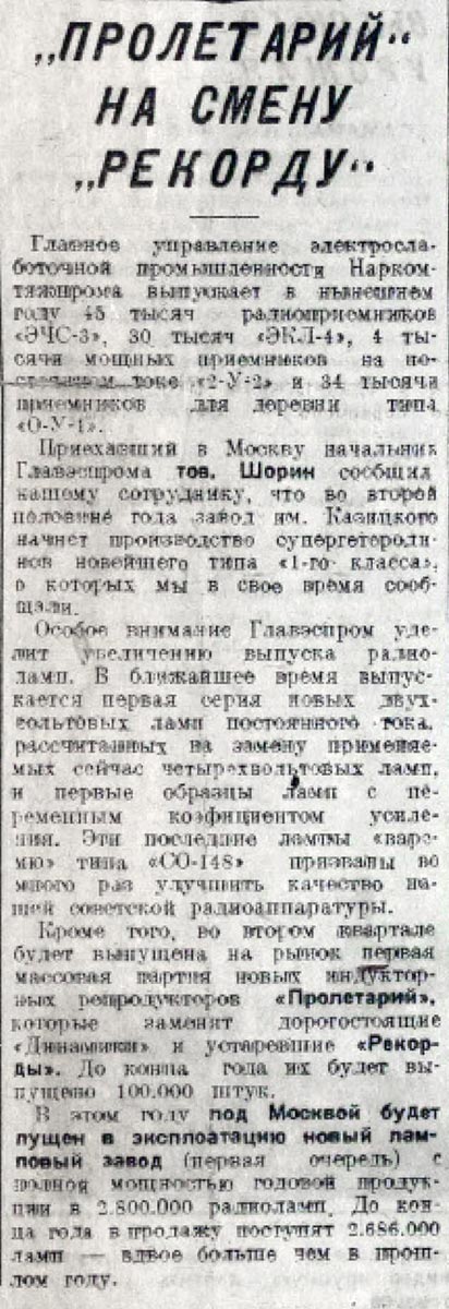 громкоговоритель "Пролетарий" с 1934 года выпускал Нижнегородский (Горьковский)