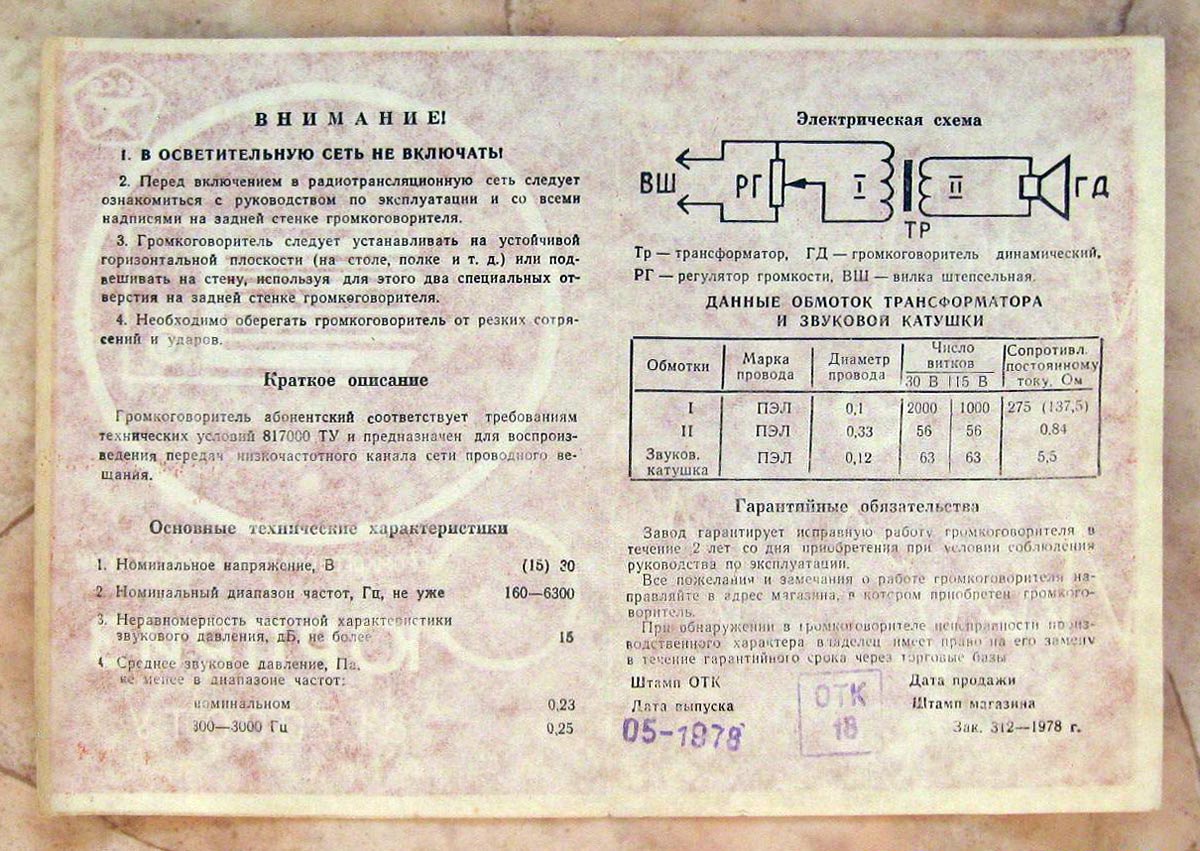 по эксплуатации абонентского громкоговорителя 1965 года. выпуска.