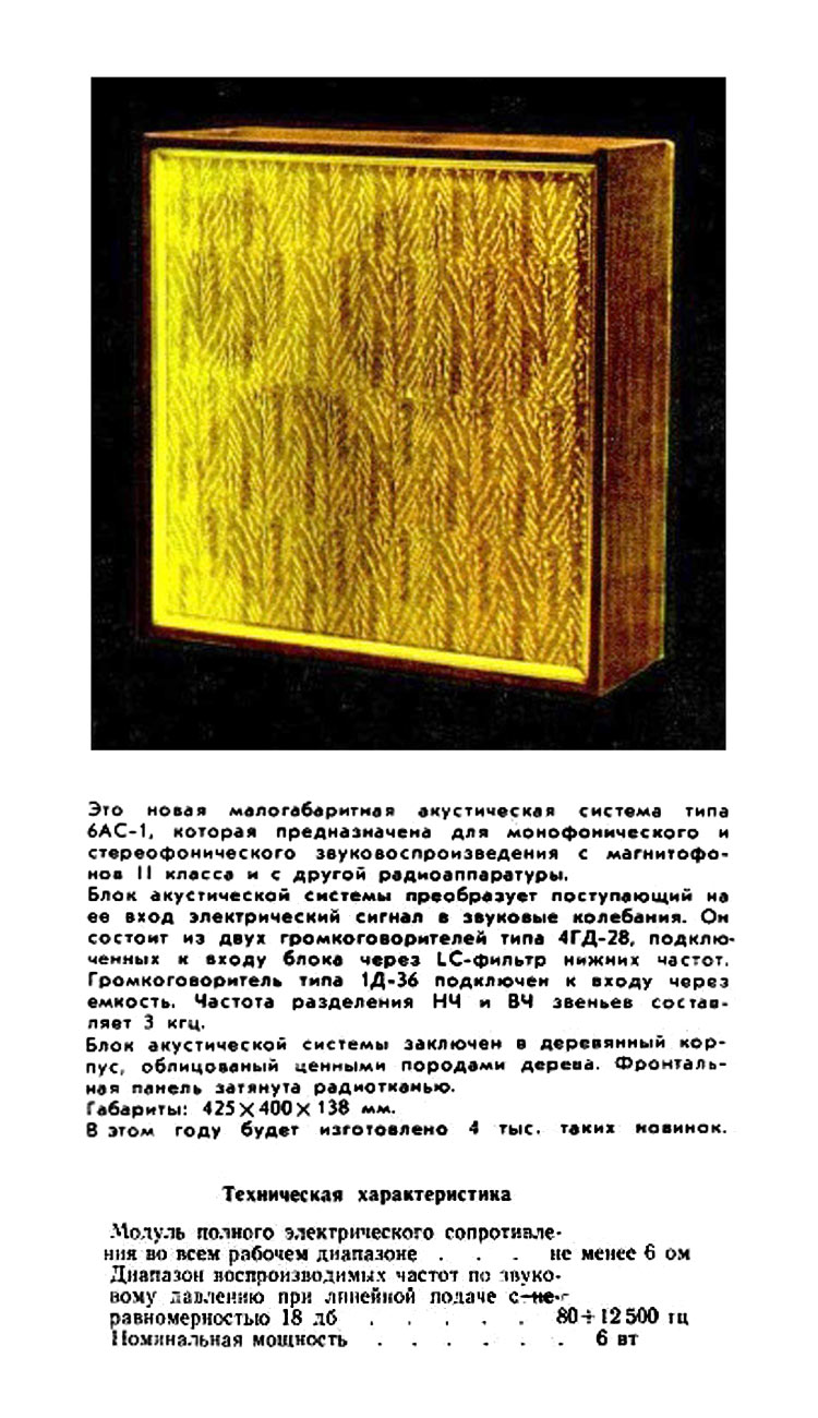 6 Ом. В АС установлено 3 громкоговорителя, два 4ГД-28 и один 1ГД-36 подключенный