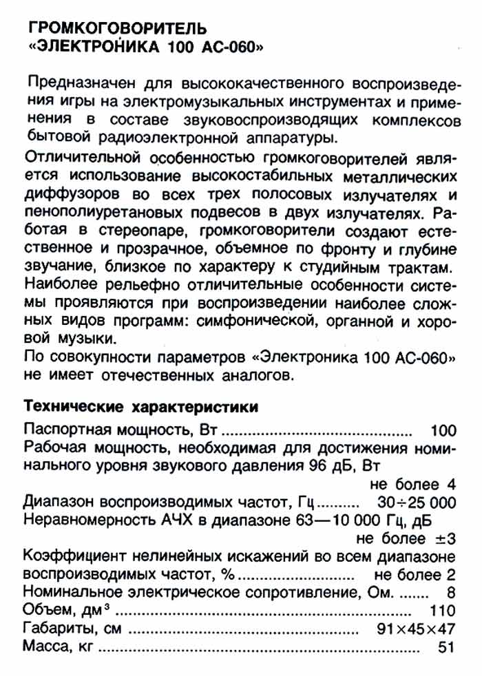 Гц. Неравномерность АЧХ ±3%. КНИ 2%. Электрическое сопротивление 8 Ом.