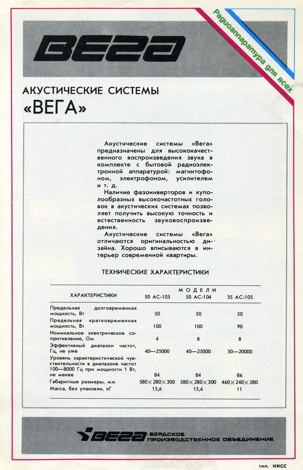 Бердский радиозавод. Диапазон частот: 50...20000 Гц. Чувствительность: 86 дБ. Долговременная мощность: 35 Вт. Кратковременная мощность: 90 Вт. Рекомендуемая мощность усилителя: 15...35 Вт. Сопротивление: 8 Ом. Размеры АС: 460х240х280 мм. Вес: 11 кг. Более подробная информация о параметрах АС