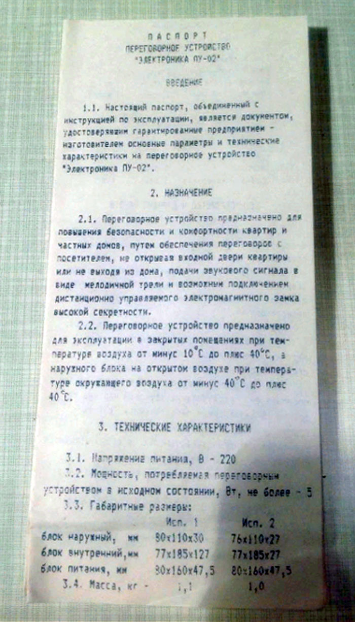 Переговорное устройство "Электроника ПУ-02" выпускалось с 1992 года Ростовским заводом при НИИ микротехники. Информация об устройстве только в фотографиях.