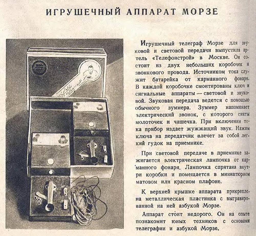 Детский игрушечный аппарат "Морзе" с 1940 года выпускала Московская артель "Телефонстрой". Заметка опубликована в журнале "Техника Молодёжи" № 12 за 1940 год.