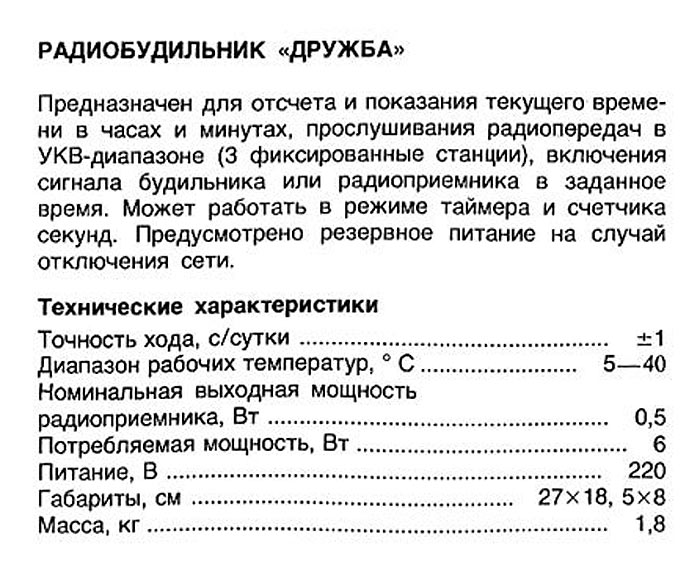 Радиобудильник (приёмник с таймером) "Дружба" серийно выпускался с 1982 года в Армении. Инструкция по эксплуатации и электрические схемы радиобудильника "Дружба".