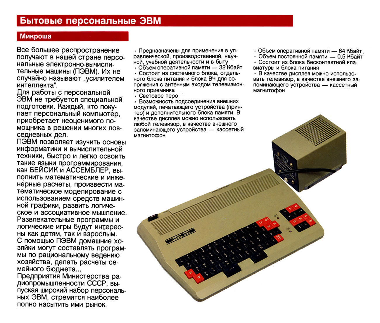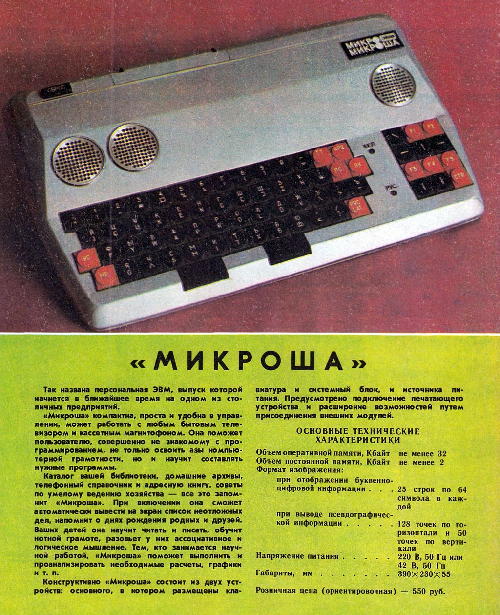 8-разрядный микрокомпьютер "Микроша" выпускался с 1987 года Лианозовским электромеханическим заводом. Один из первых бытовых компьютеров в СССР.