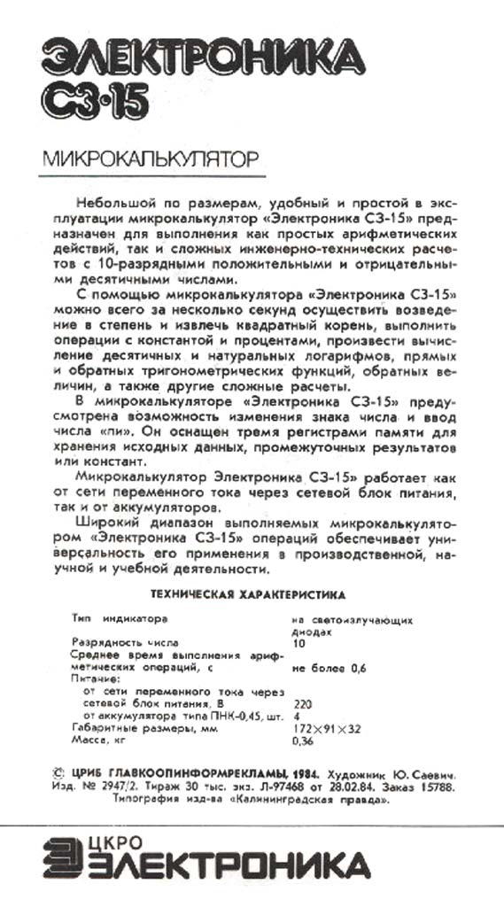 Микрокалькулятор "Электроника С3-15" с 1980 года выпускало Ленинградское объединение электронного приборостроения "Светлана".