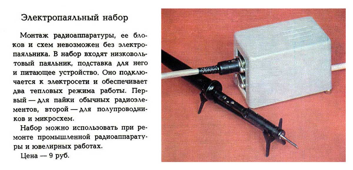 Электропаяльный набор выпускался предположительно с 1982 года. Рекламный проспект об электропаяльном наборе из каталога "Товары народного потребления" за 1984 год.