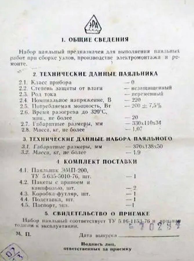 по ТУ5.16-1153-76. Предназначен для выполнения паяльных работ при электромонтаже,