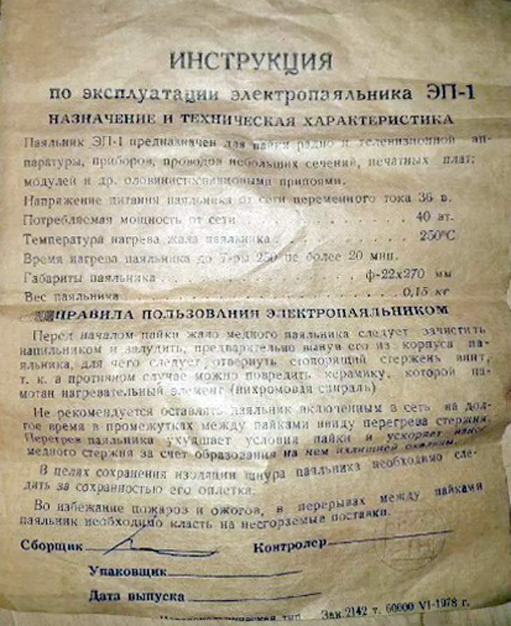 Мощность электропаяльника 40 Вт. Рабочее напряжение 36 В переменного тока.