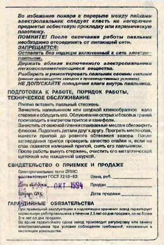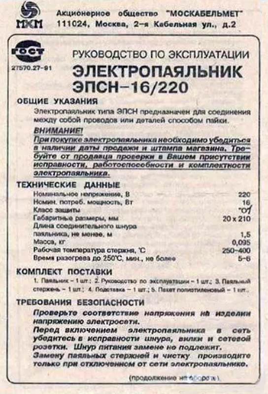 мощность 16 Вт. Рабочая температура жала электропаяльника 250-400 градусов