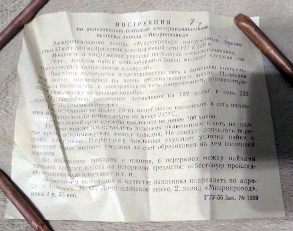 7219-54. Мощность электропаяльника "ЭТ-П" - 50 ватт. Рабочее напряжение