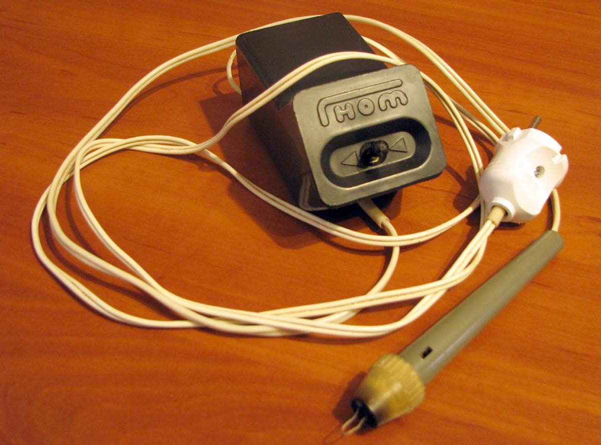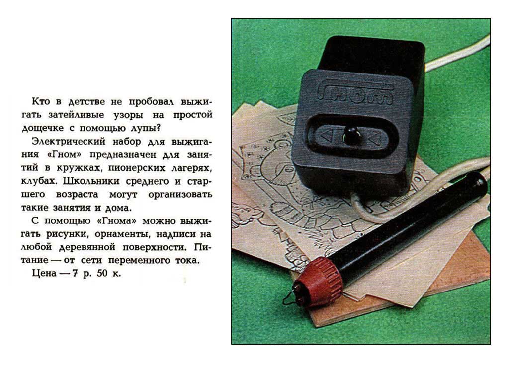 Набор для выжигания "Гном" выпускался предположительно с 1976 года "Минский электромеханический завод". Набор предназначен для выжигания переводных рисунков на гладкой деревянной поверхности.