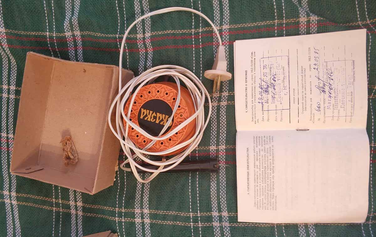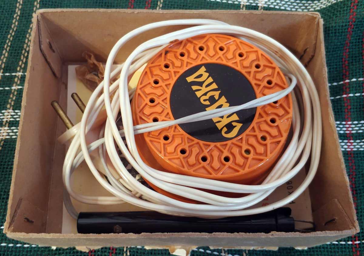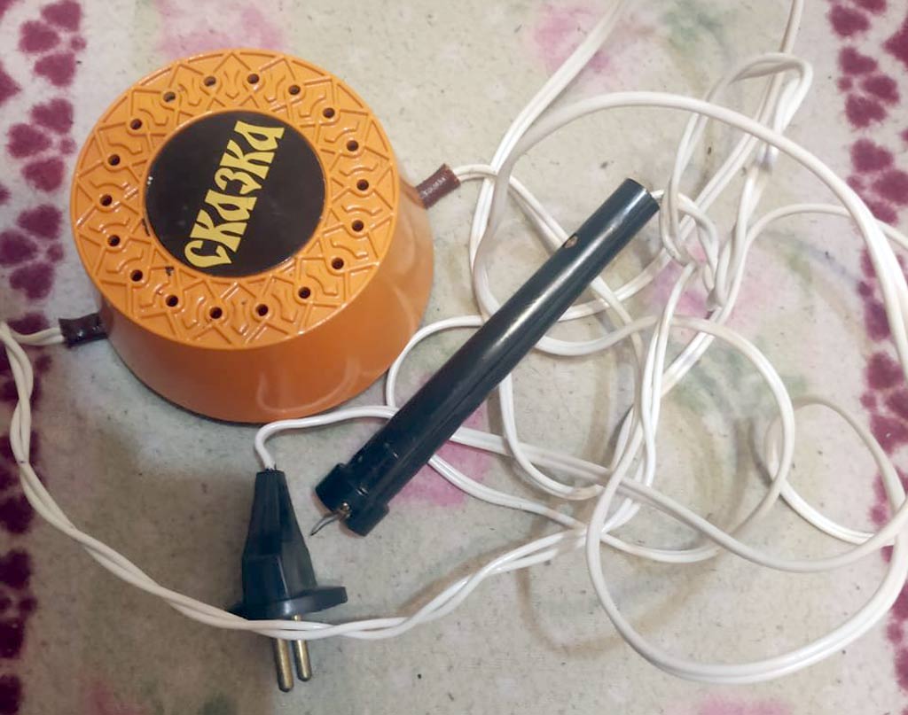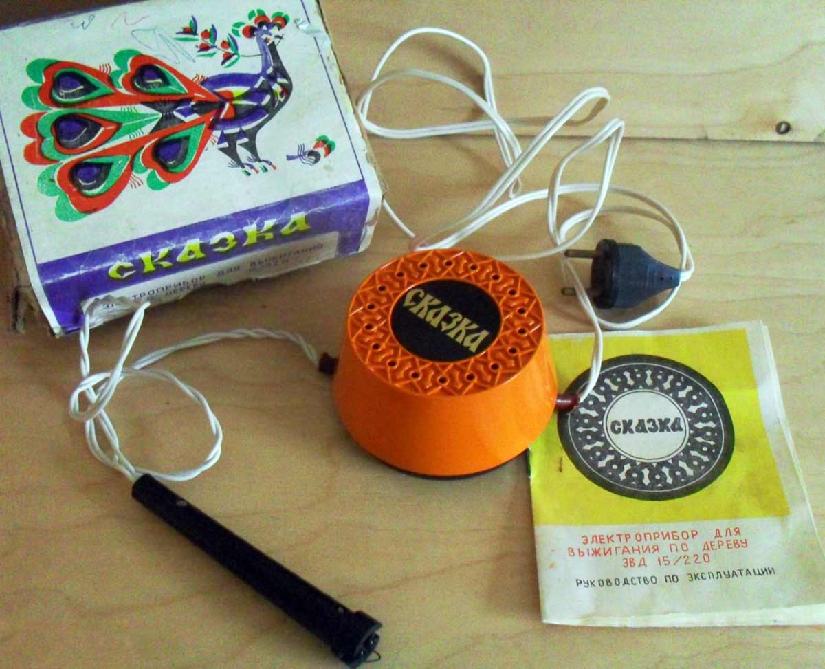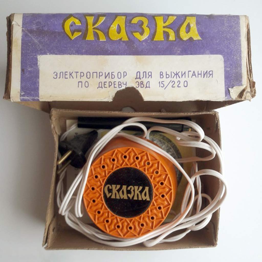 Электроприбор для выжигания по дереву "Сказка" выпускался с 1985 года. Прибор предназначен для выжигания рисунков на гладкой деревянной поверхности.
