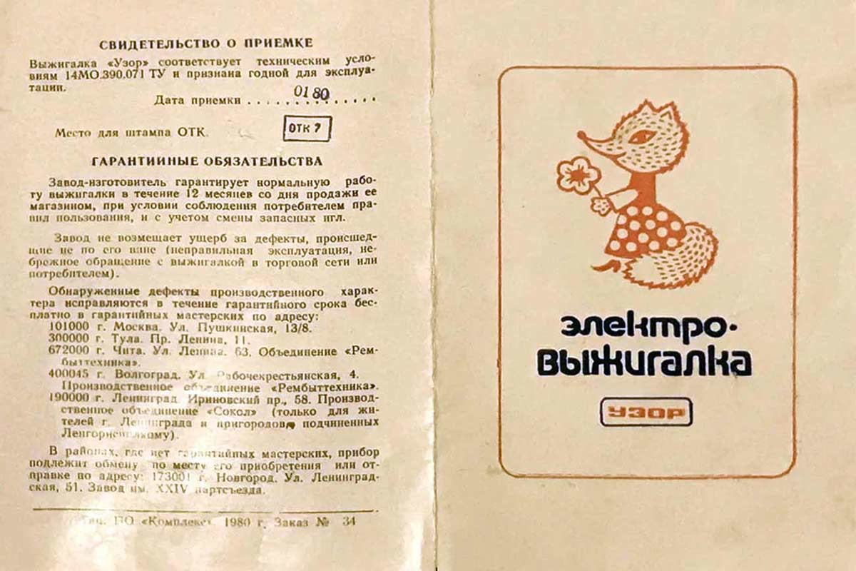 Электро-выжигалка "Узор" (ВЭД) выпускалась возможно с 1975 года Новгородским заводом имени XXIV партсъезда. Служит для выжигания по дереву.