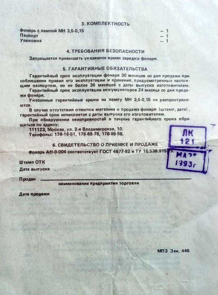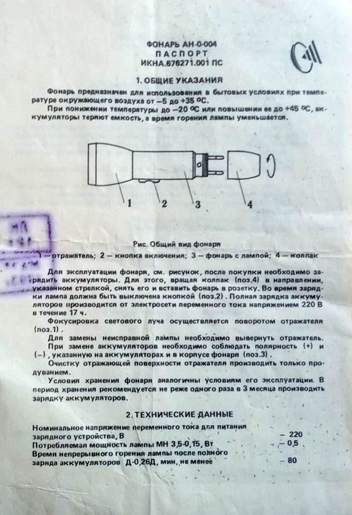 Фонарь аккумуляторный "АН-0-004" выпускался возможно с 1992 года. Фонарь бытовой, перезаряжаемый предназначен для индивидуального местного освещения. Время непрерывного горения 1 час 20 мин.