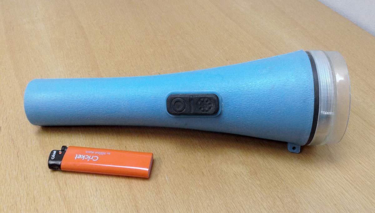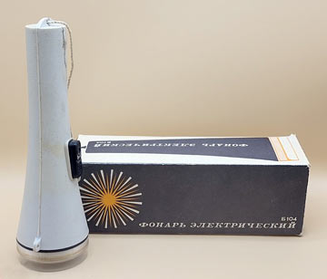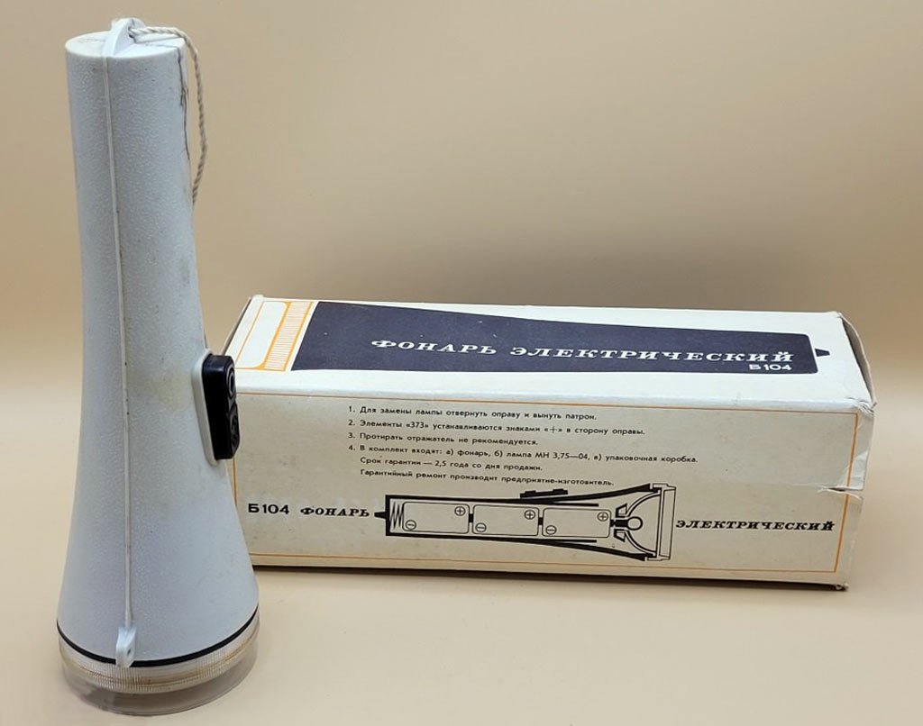 Фонарь электрический "Б-104" выпускался предположительно с 1988 года. Питание от трёх элементов А-373, лампочка на 3,75 вольта и ток 0,4 ампера.