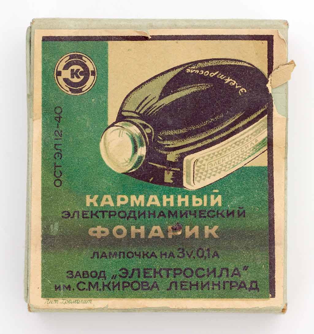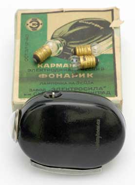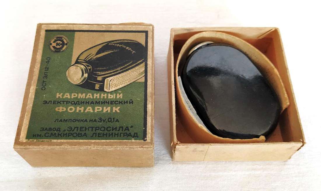 Карманный электродинамический фонарик предположительно с 1940 года выпускал Ленинградский завод "Электросила" им. С.М.Кирова. Народное название "Жучок".