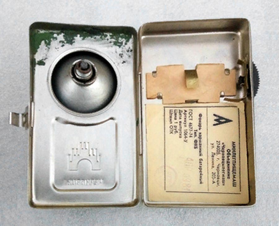 Фонарь карманный батарейный "ФКБ" выпускался предположительно с 1975 года объединением "Черновцылегмаш", Украина. Соответствует ГОСТ 4677-74. Батарея типа "КБС-Л-0,50". Лампочка МН 3,5 х 0,26 А.