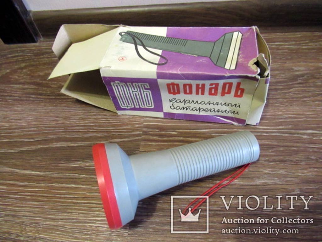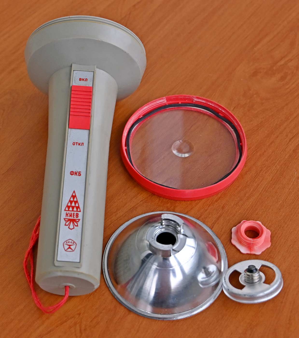 Фонарь карманный батарейный "ФКБ" выпускался возможно с 1982 года Киевским заводом "Киевпластмасс". Питание 2 элемента 373. Лампочка 2,5 В х 0,15 А.