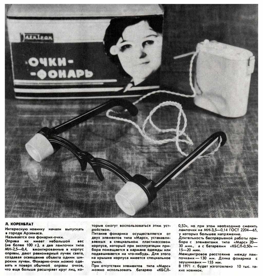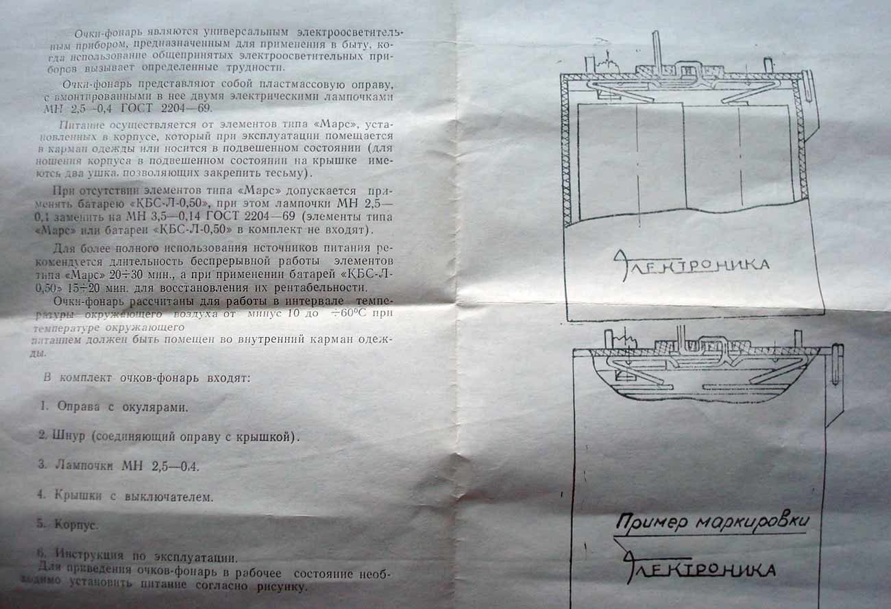Очки-фонарь выпускались с 1971 года в городе Арзамас. Предназначены для мест, где недостаточно внешнего освещения.
