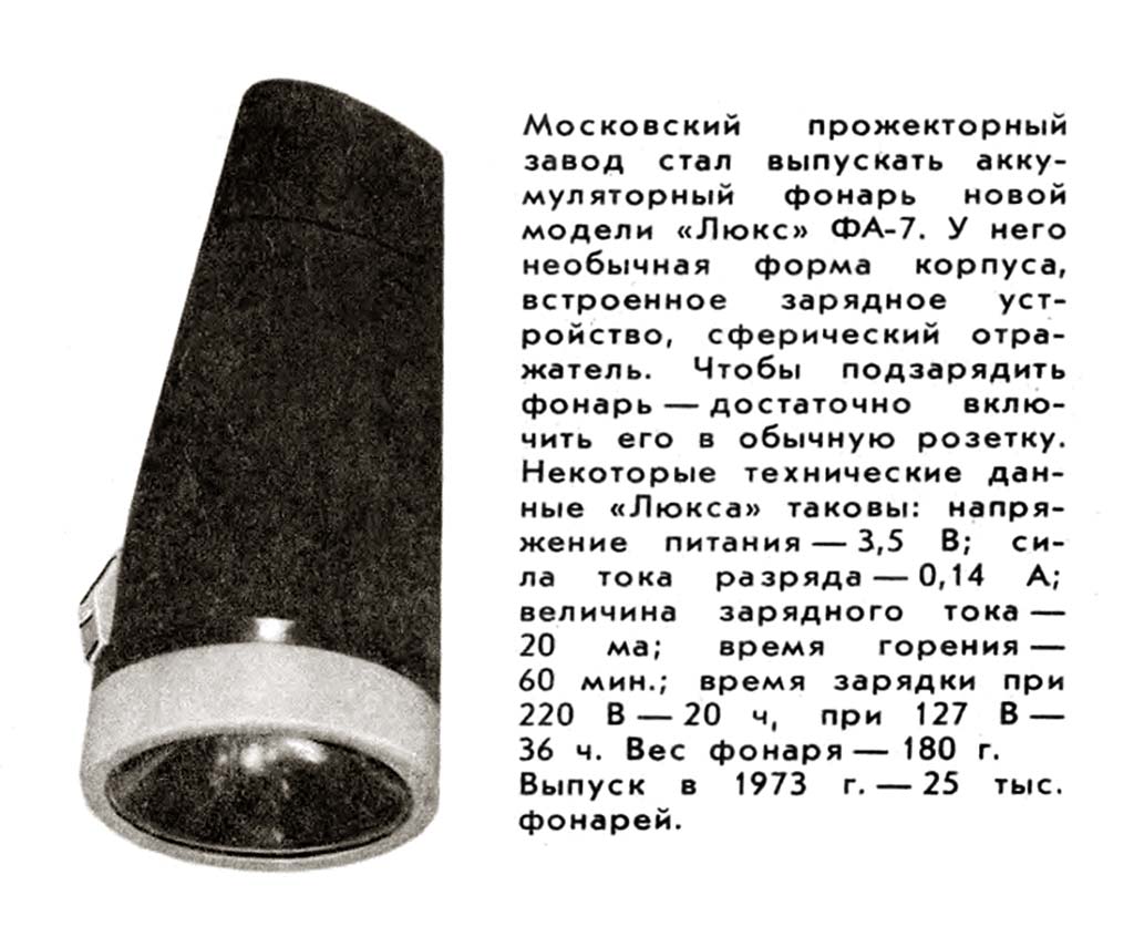 Аккумуляторный фонарь "Люкс" ФА-7 выпускал с 1973 года Московский прожекторный завод. Информация по фонарю только визуальная.