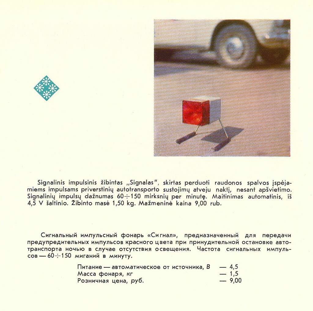 Автомобильный сигнальный импульсный фонарь "Сигнал" с 1972 года выпускал Паневежский завод точной механики, (ПТО вычислительной техники "Сигма").
