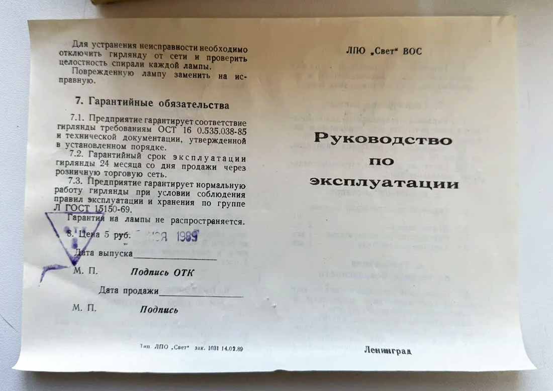 Ёлочная электрогирлянда "Фонарик" выпускалась с 1989 года Ленинградским ПО "Свет". Питание 220 вольт. 18 крашенных ламп.