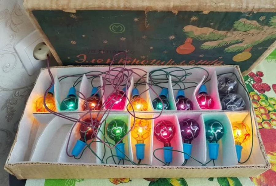 Электрогирлянда ёлочных ламп "ЕГ-25" выпускалась предположительно с 1965 года Московским электроламповым заводом. Рабочее напряжение 220 В. 15 ламп. 2 запасных.