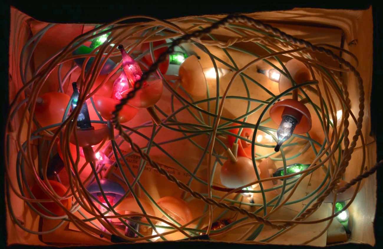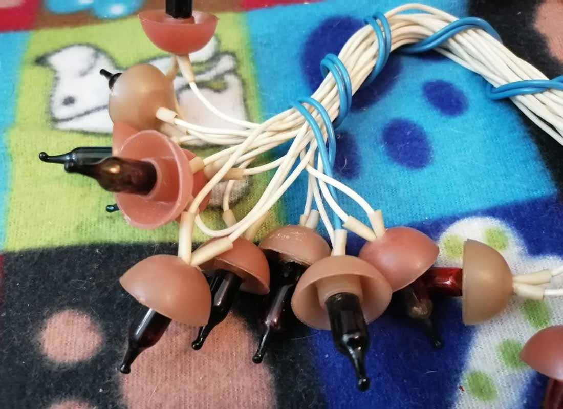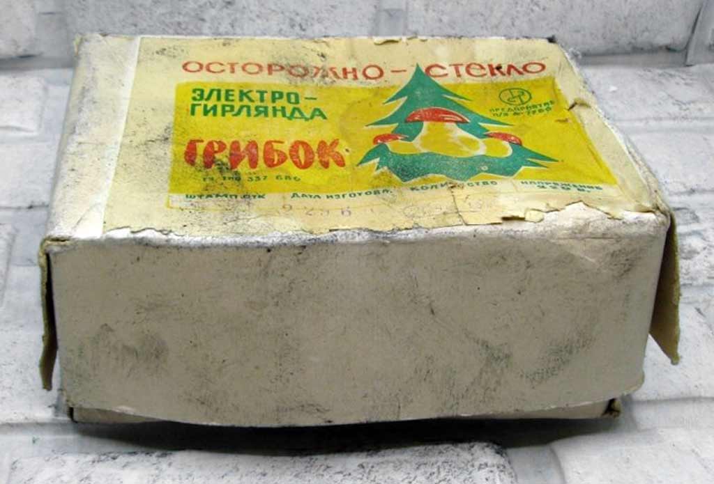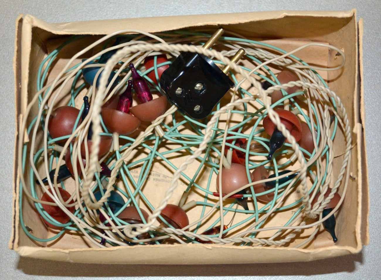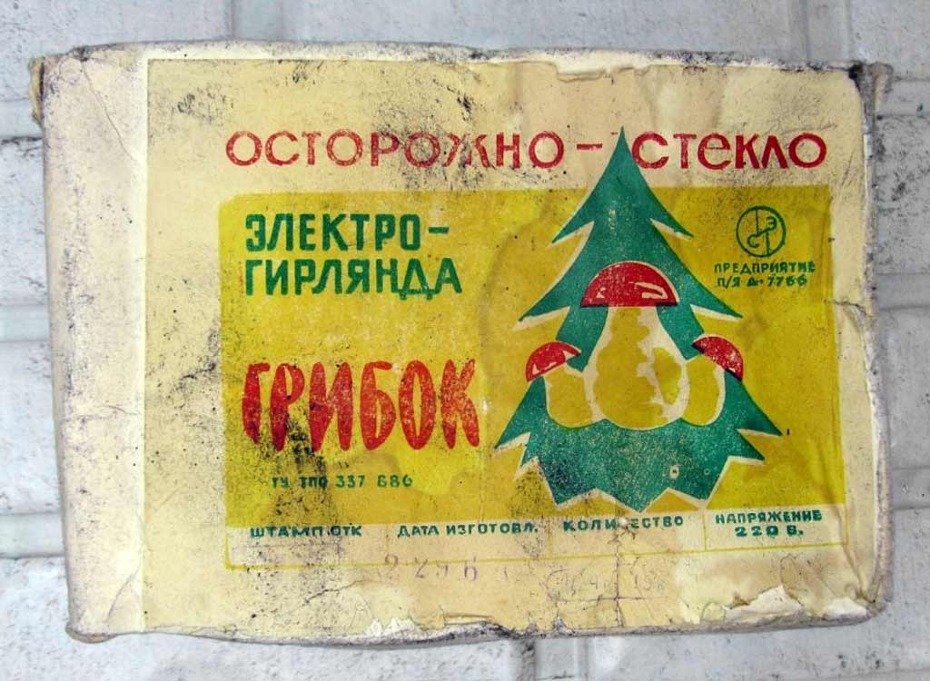 Электрогирлянда "Грибок" производилась возможно с 1963 года предприятием п/я 7766. Гирлянда предназначена для иллюминационного украшения новогодней ёлки. Питание 220 В. Ламп 18 шт. + 3 запасных.