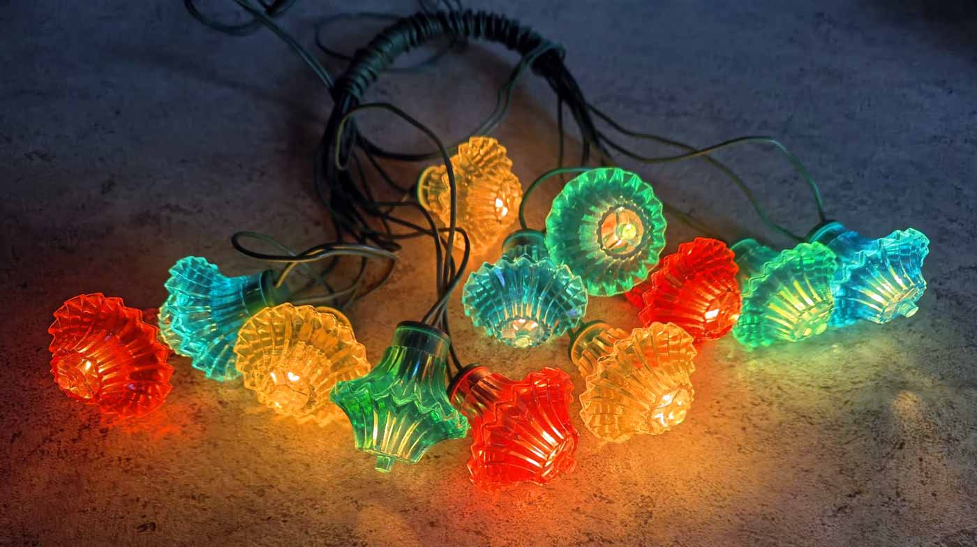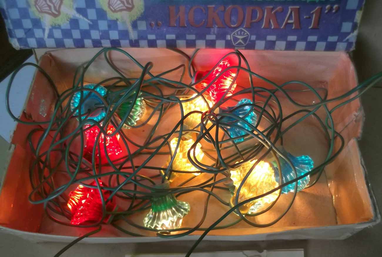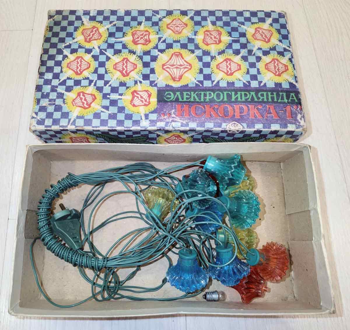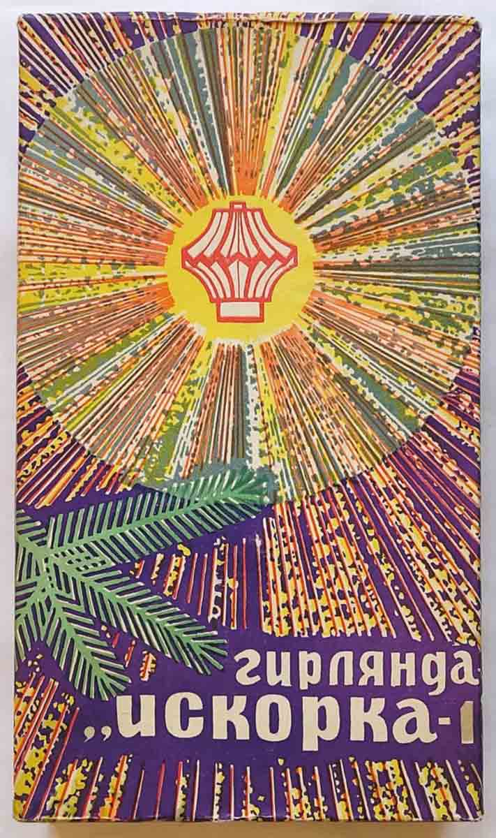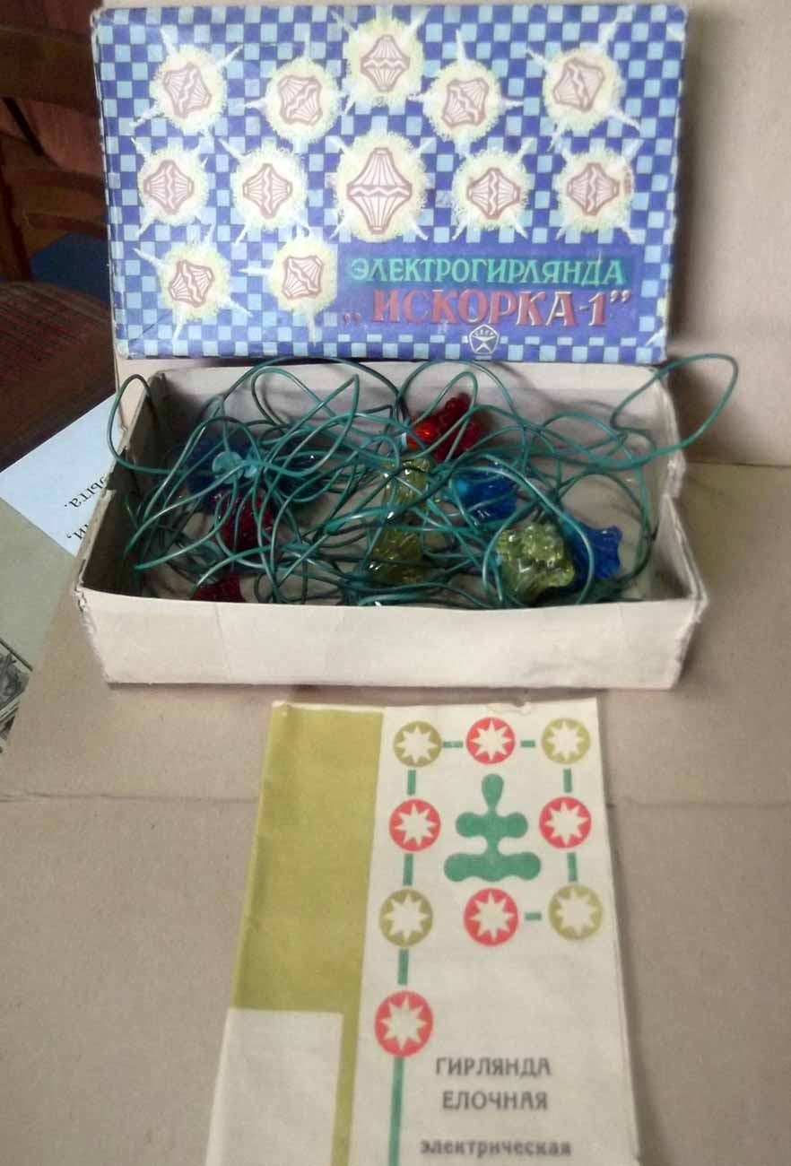 Гирлянда электрическая ёлочная "Искорка-1" производилась предположительно с 1982 года Киевским заводом "Укркабель". Питание - сеть 220 В. Ламп 12 + 2 запасных. Лампы - Е-26,5. Цветов - 4. Цена 4 рубля.