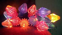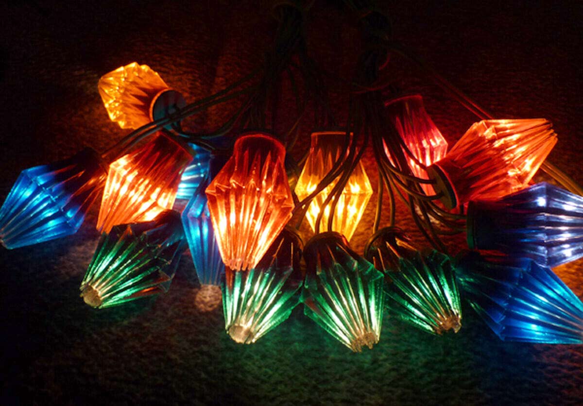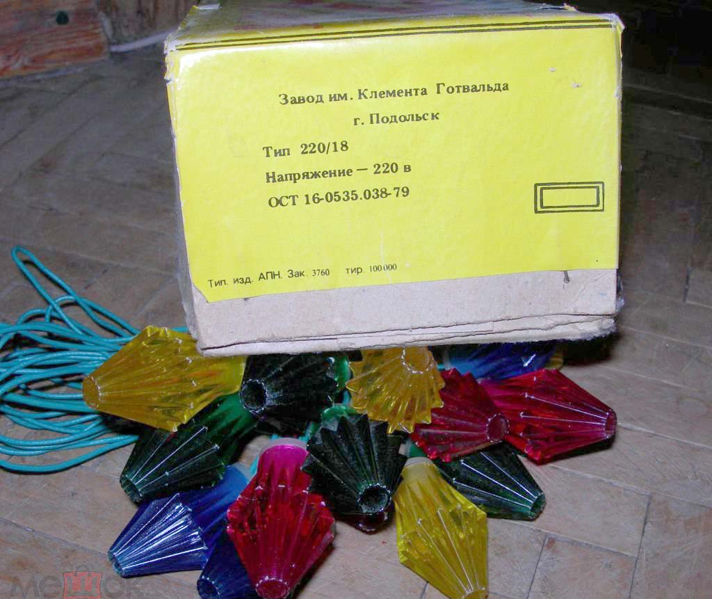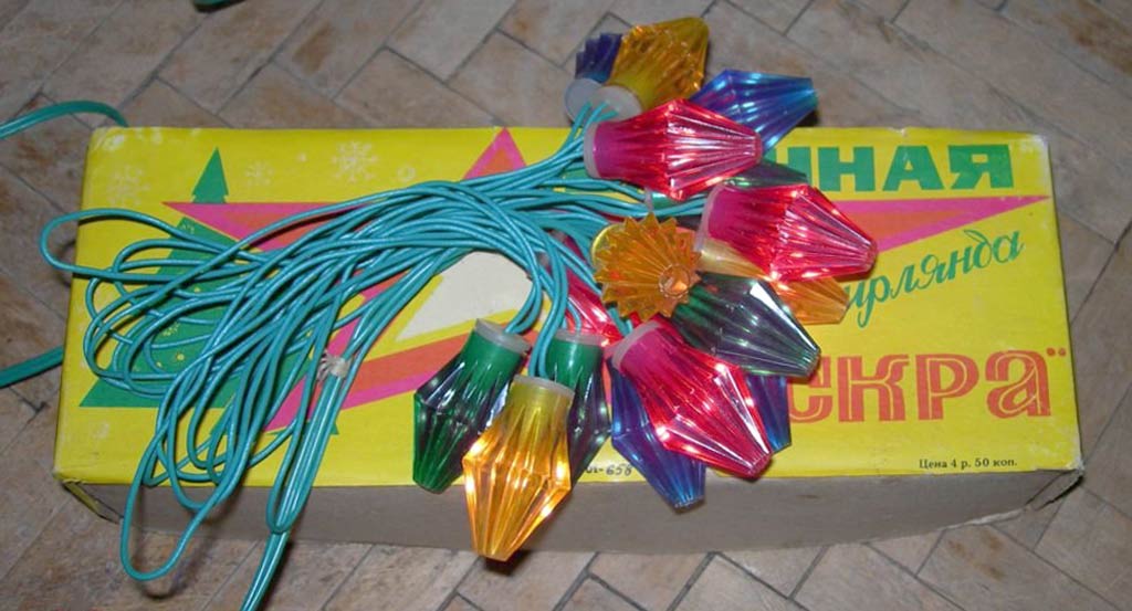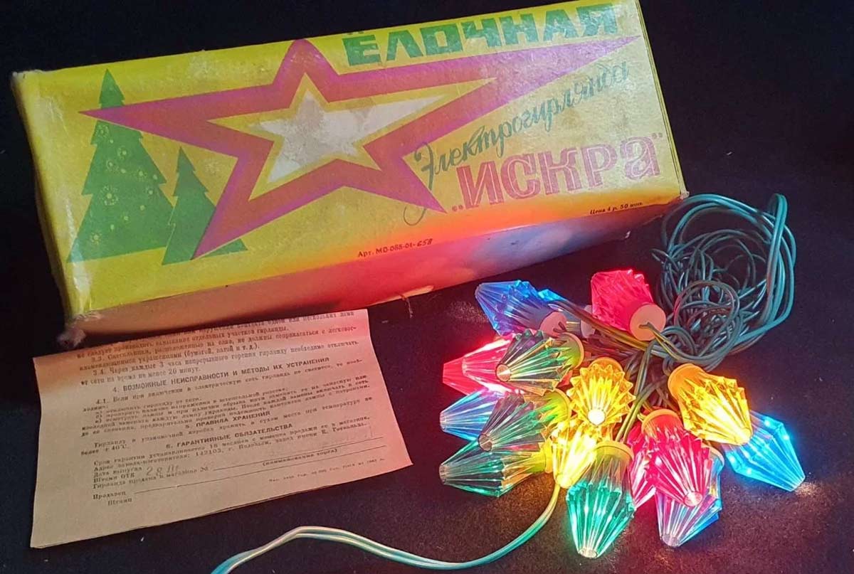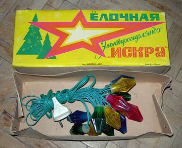 Ёлочная гирлянда "Искра" выпускалась предположительно с 1983 года Подольским заводом имени Клемента Готвальда. 16 ламп. 4 цвета. Питание - 220 В.