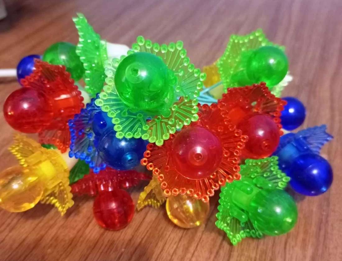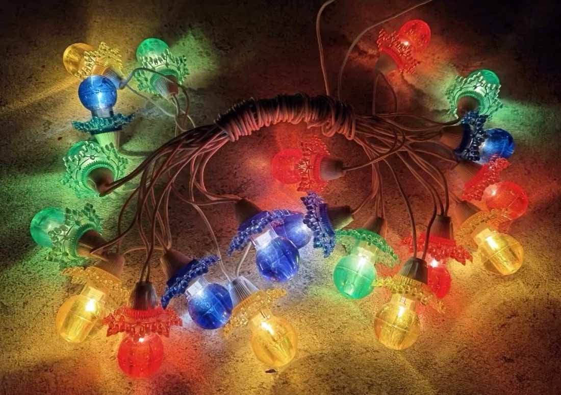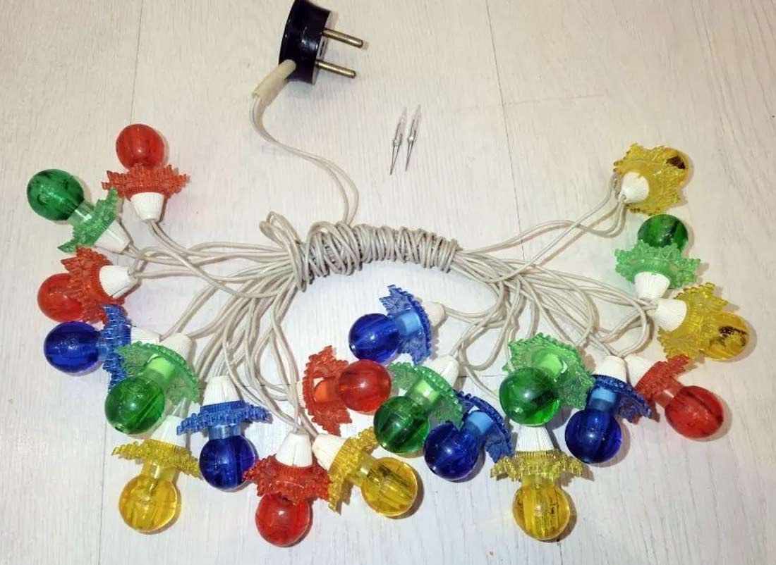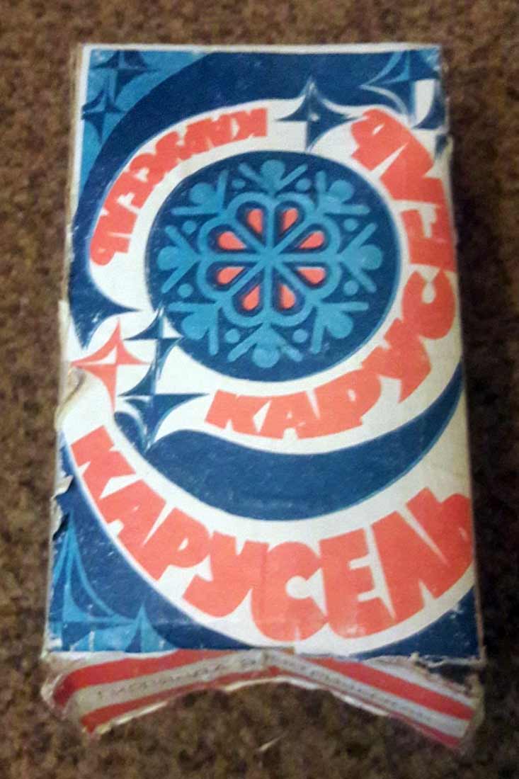 Гирлянда электрическая "Карусель" производилась предположительно с 1981 года Смоленским электроламповым заводом. Питание от сети - 220 В. Ламп - 20. Тип - Е-13,5 х 0,06. Фонарики из цветного оргстекла.