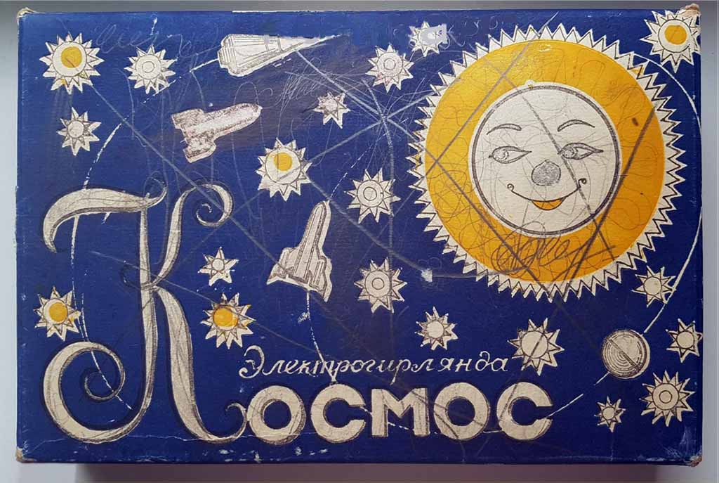 Электрическая ёлочная гирлянда "Космос" производилась несколькими предприятиями страны возможно с 1973 года и далее. Гирлянды разных предприятий в основном схожие. Ламп 18 или 20. Тип Е-13,5 х 0,16.