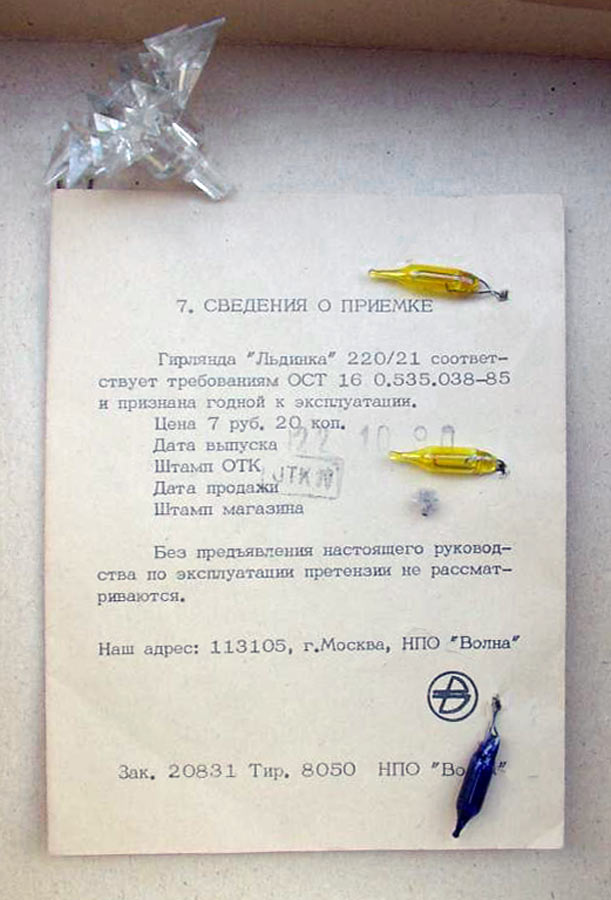 Электрическая гирлянда "Льдинка" выпускалась возможно с 1989 года Московским НПО "Волна". 21 лампа. Цвета - красный, жёлтый, зелёный. ~ 220 В.