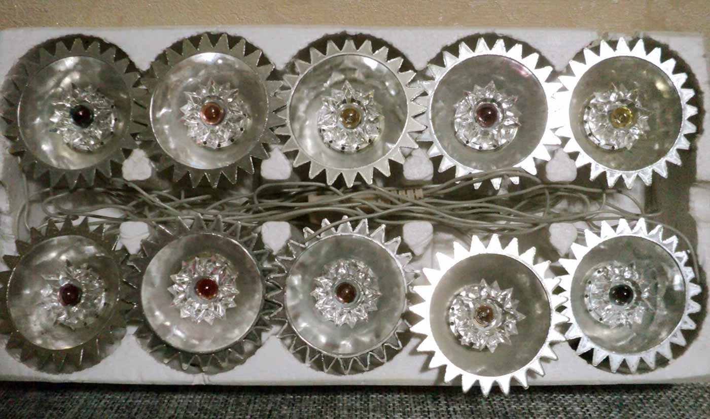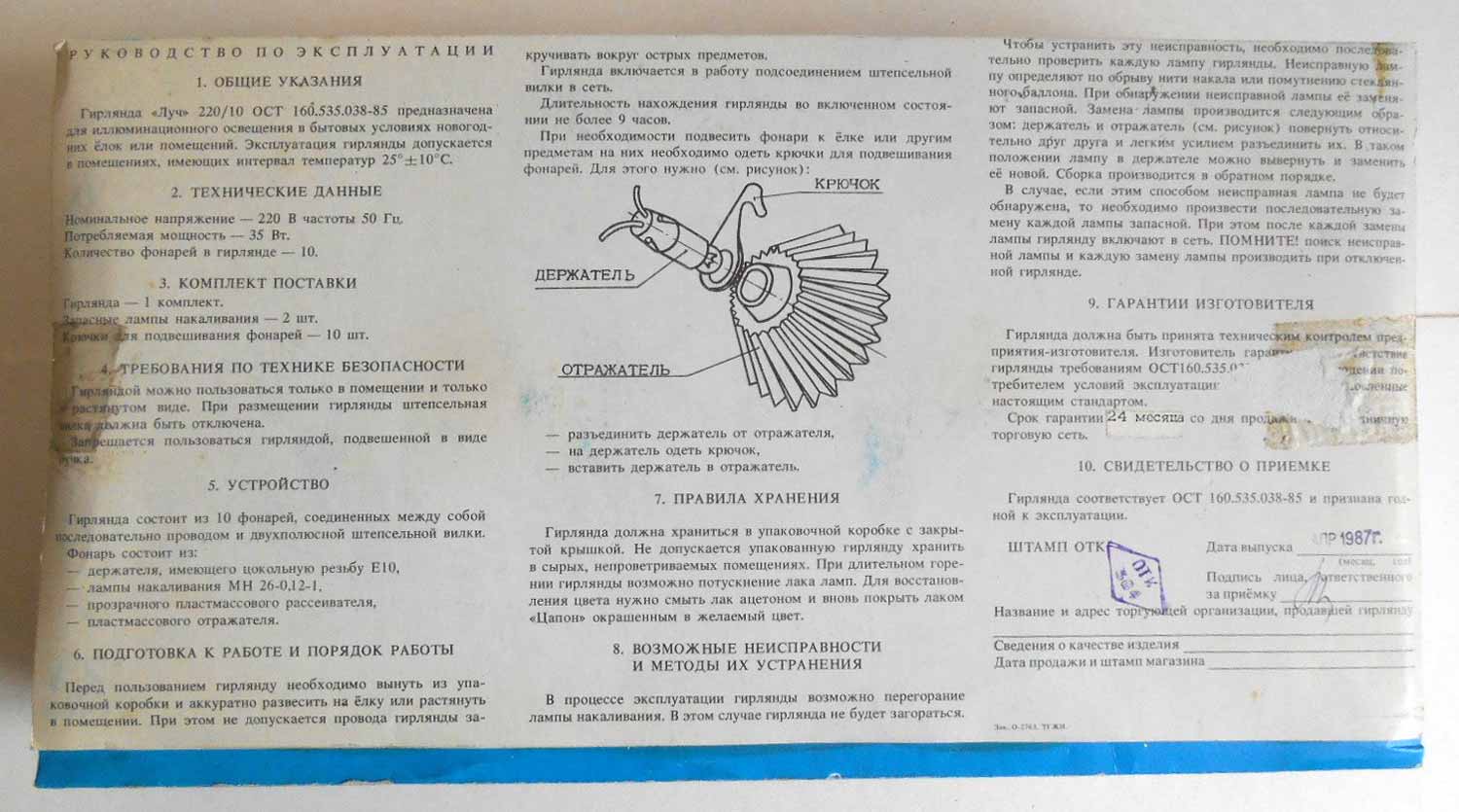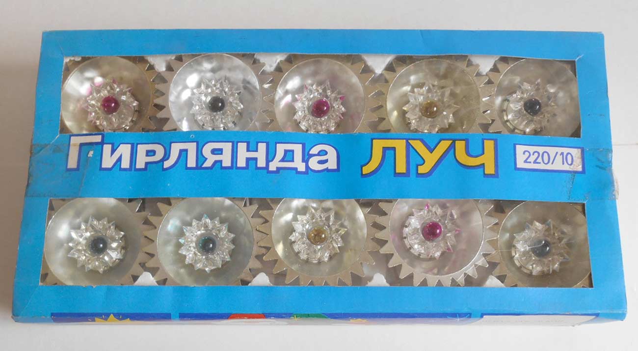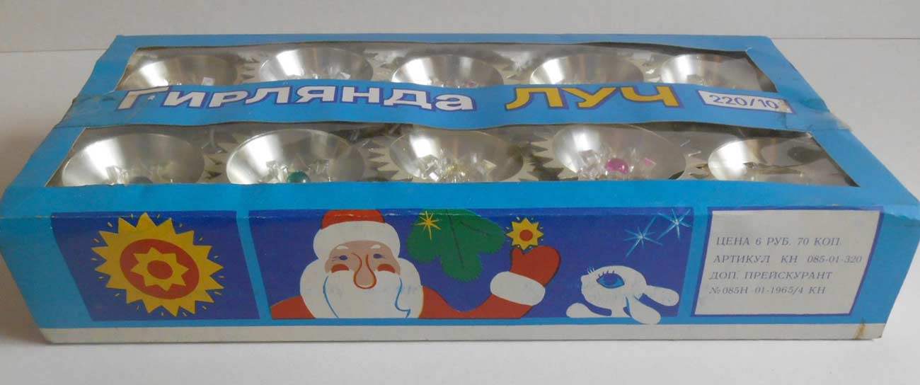 Электрическая ёлочная гирлянда "Луч" выпускалась предположительно с 1986 года. Изготовитель не установлен. Гирлянда питается от сети 220 В. Потребляемая мощность 35 Вт. Ламп в гирлянде 10, МН 26-0,12.