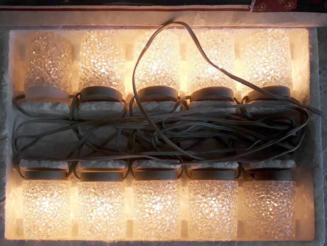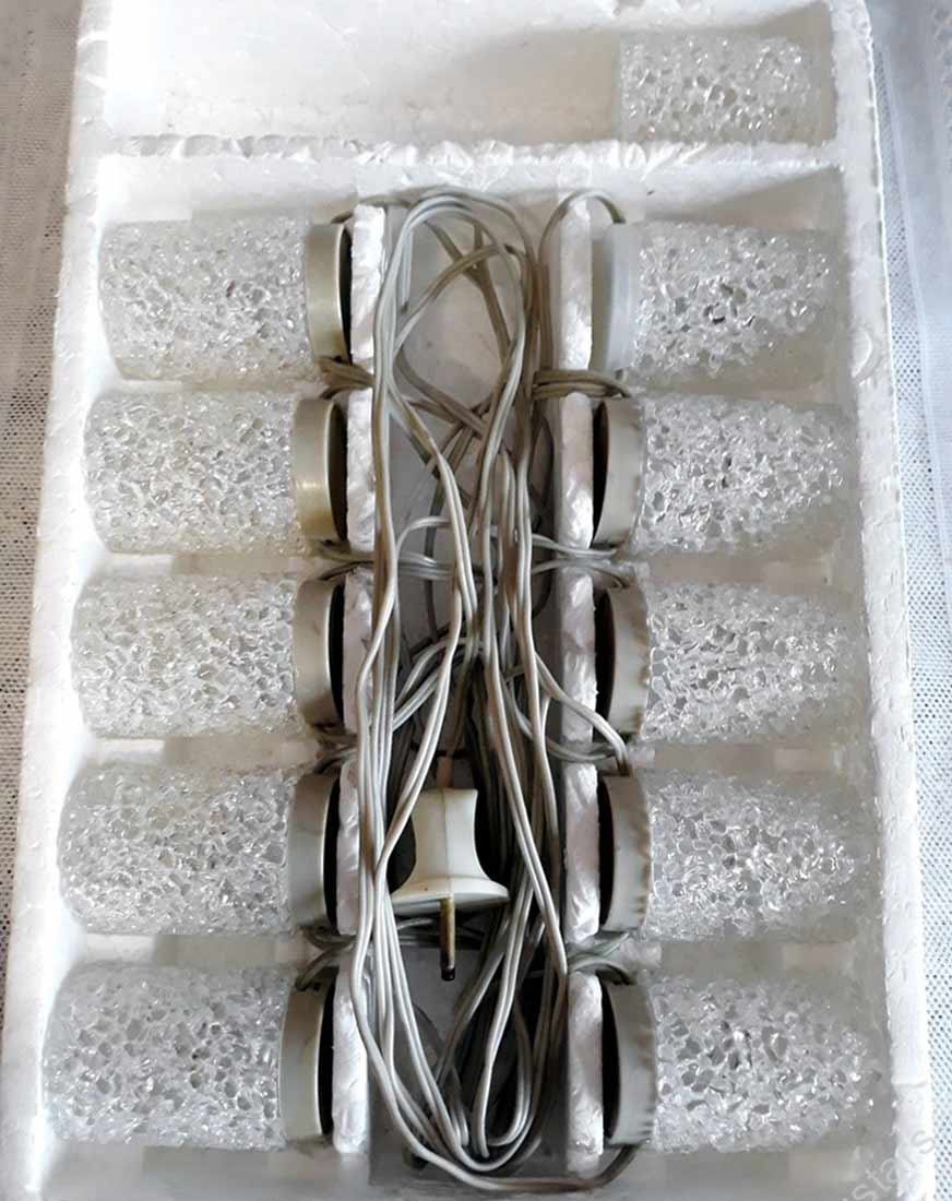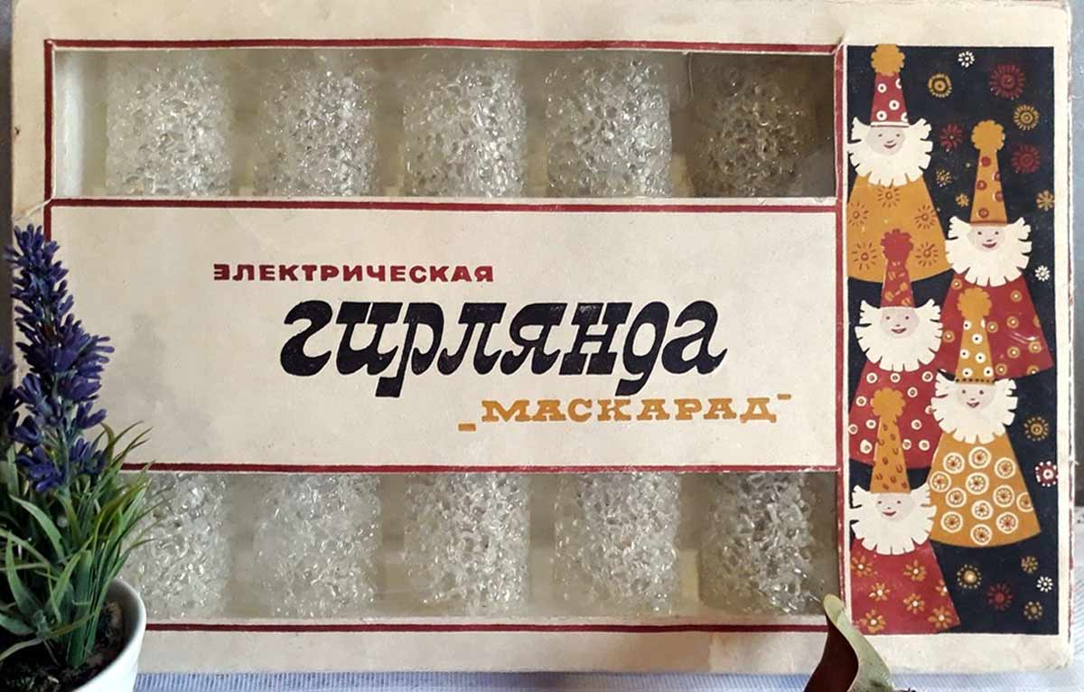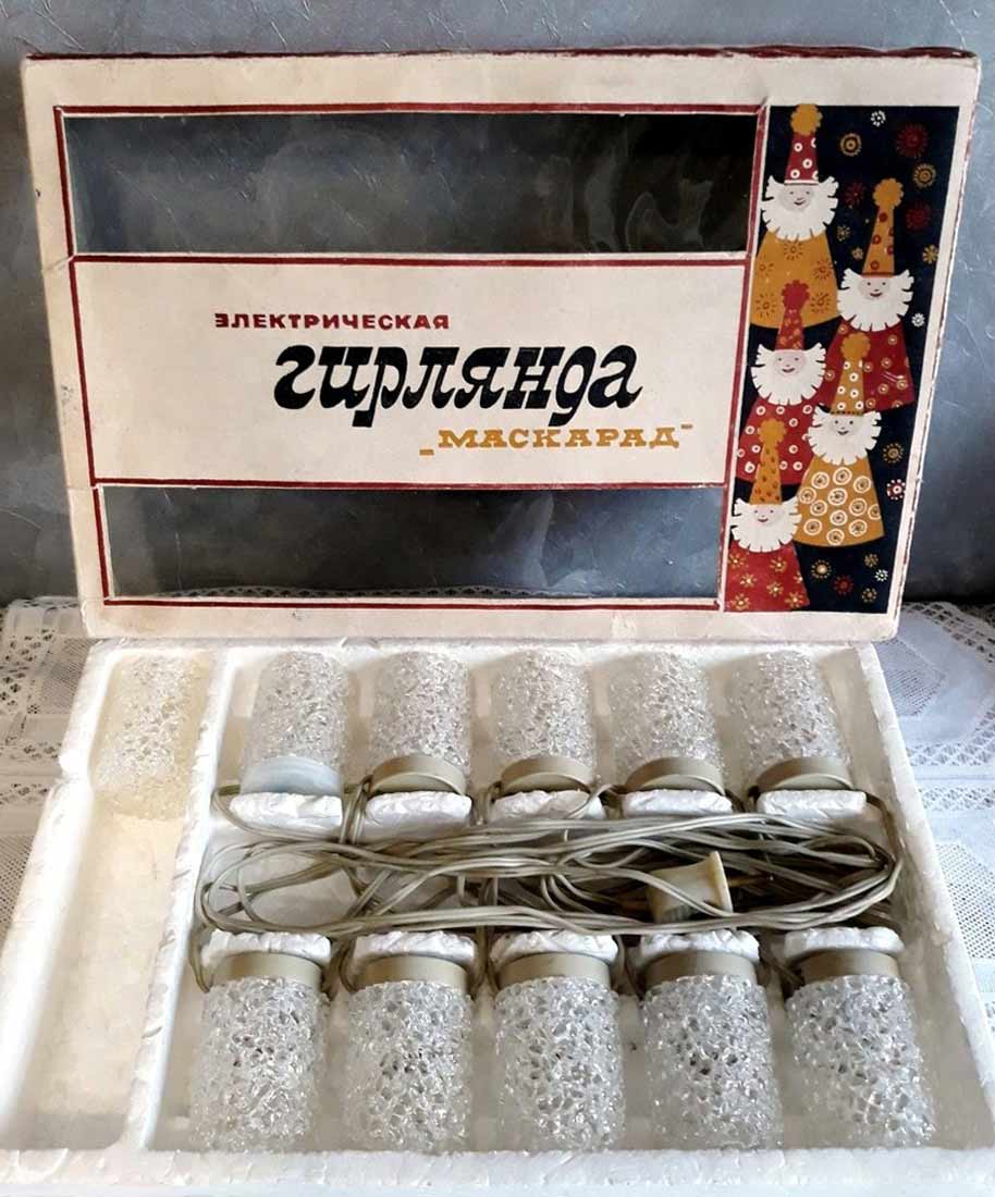 Электрическая гирлянда "Маскарад" производилась предположительно с 1970 года одним из Ленинградских предприятий (п/я). Питание от сети - 220 вольт. Ламп 10 штук на 26 вольт каждая. В запасе 2 лампы.