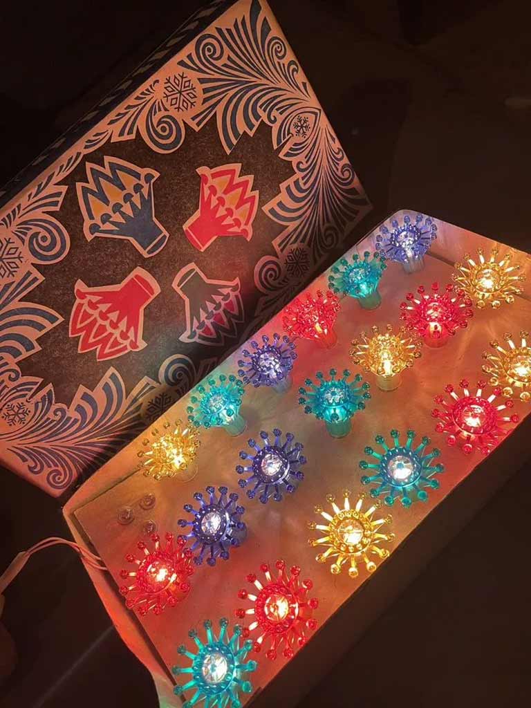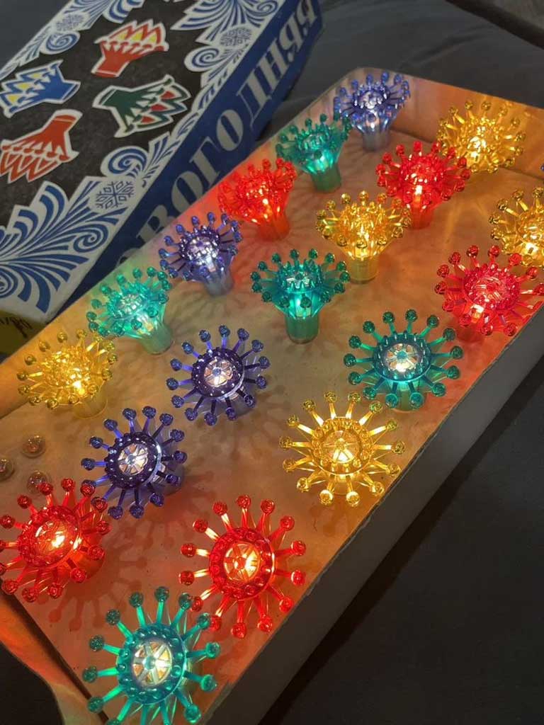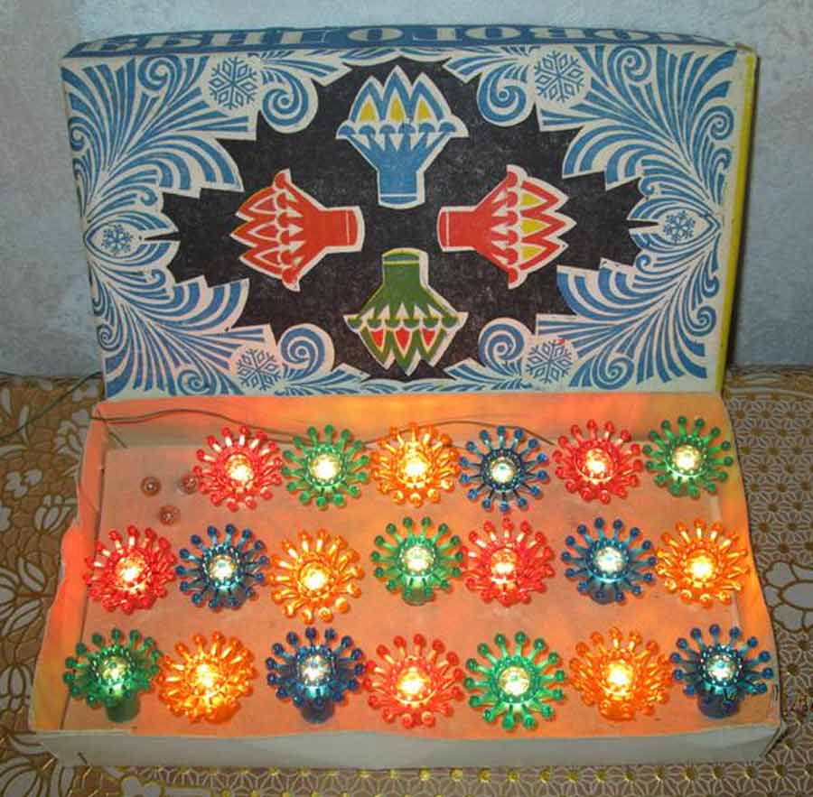 Электрогирлянда "Метелица" выпускалась возможно с 1977 года Уфимским электроламповым заводом. Питание ~ 220 В. Лампочек 20 штук по 13,5 В х 0,12 А.