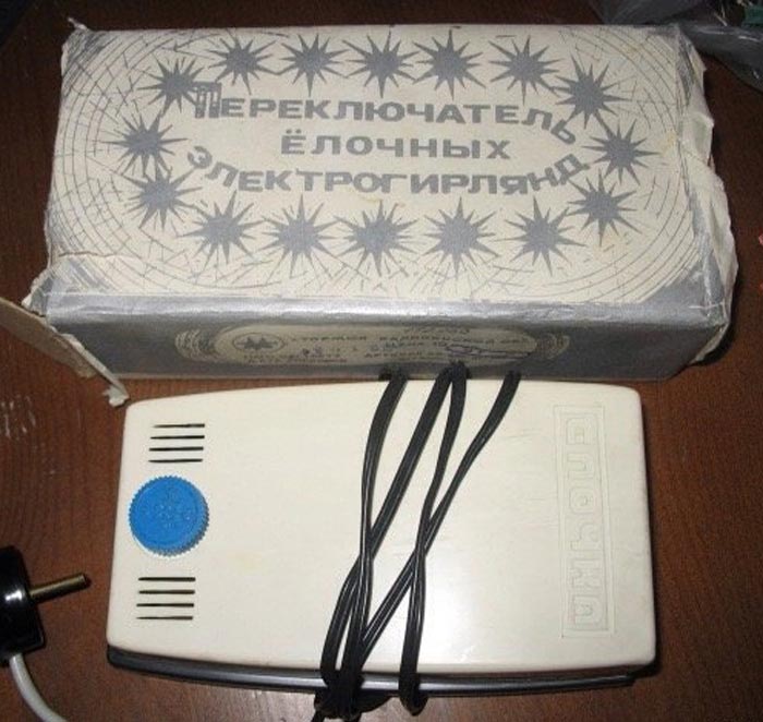 Переключатель для ёлочных гирлянд "Ёлочка" выпускался предположительно с 1977 года ПО "Планета", Великий Новгород. 2 независимых канала. Мощность 2х30 Вт.