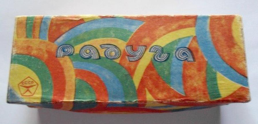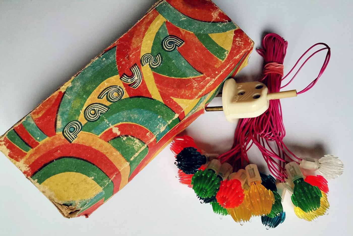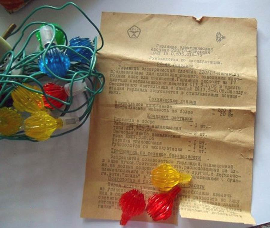 Гирлянда электрическая "Радуга" производилась возможно с 1980 года Воронежским заводом электровакуумных приборов. Питание 220 В. Потребляемая мощность 20 Вт. Ламп 18 + 3 запасных, одна мигающая.