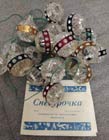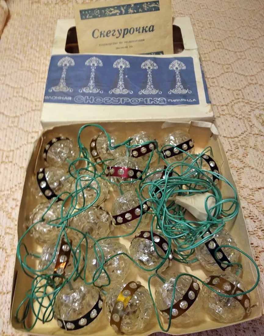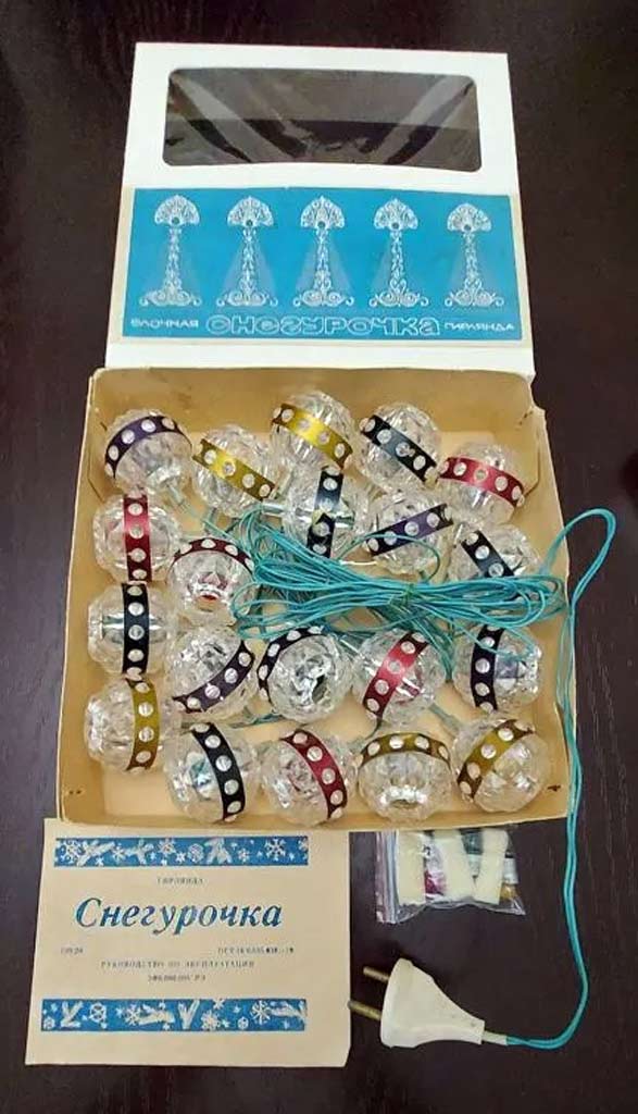 Электрогирлянда "Снегурочка" выпускалась возможно с 1976 по 1990 год Нальчикским НПО "Телемеханика". Питание 220 В. Лампы типа Е10 - 13,5 вольта 0,16 ампер. 20 штук.
