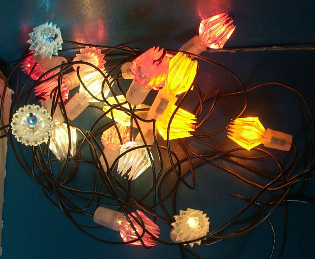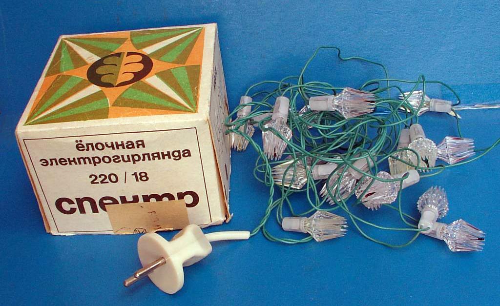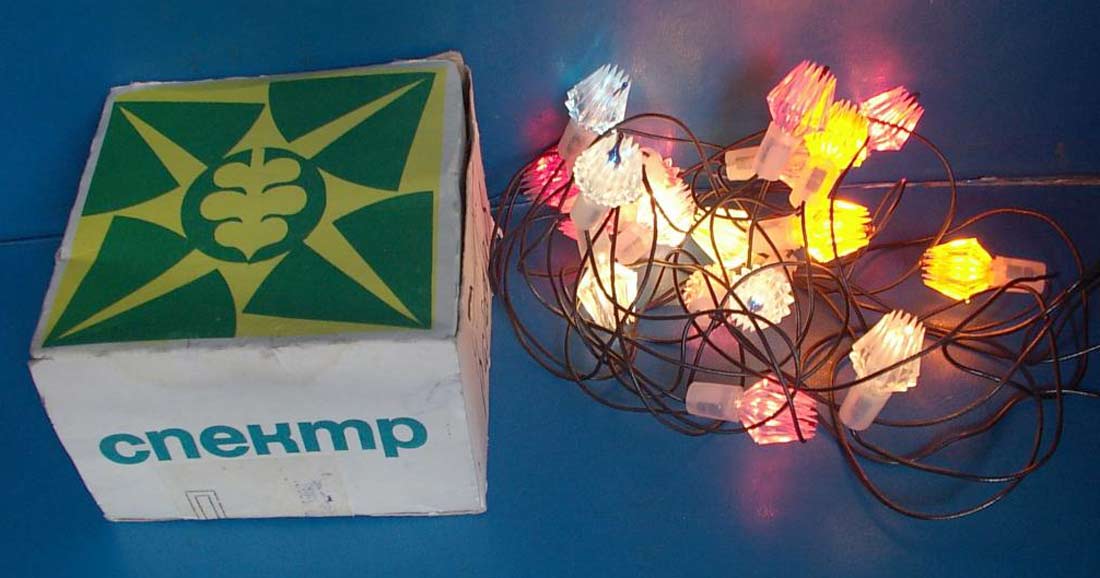 Ёлочная гирлянда "Спектр" выпускалась возможно с 1977 года филиалом Московского электролампового завода, Краматорским заводом "Альфа". Питание сеть 220 В. Ламп в гирлянде 18. Одна лампа мигающая.
