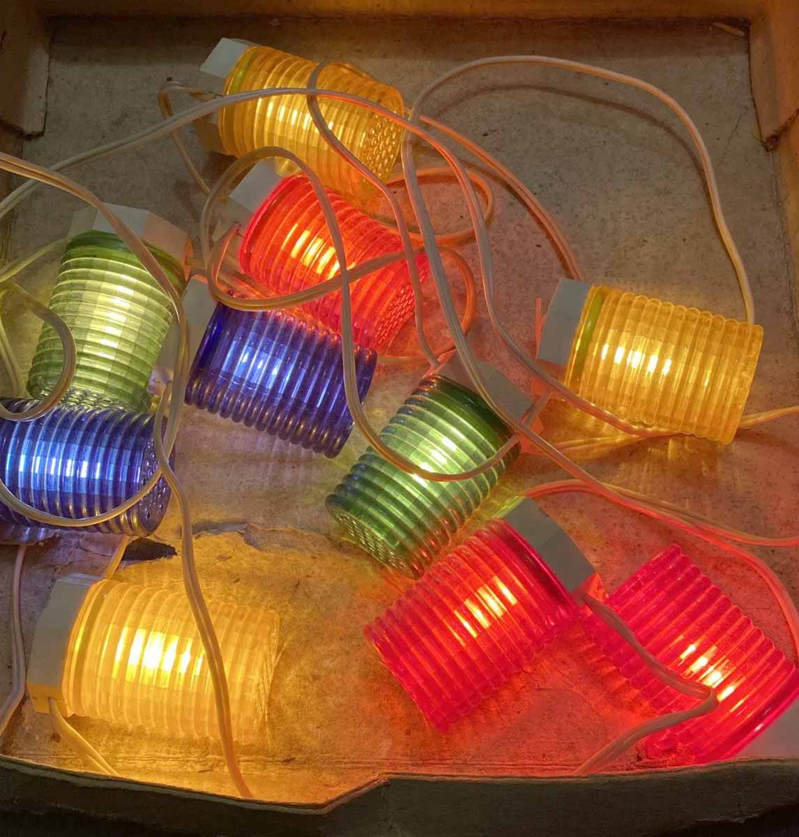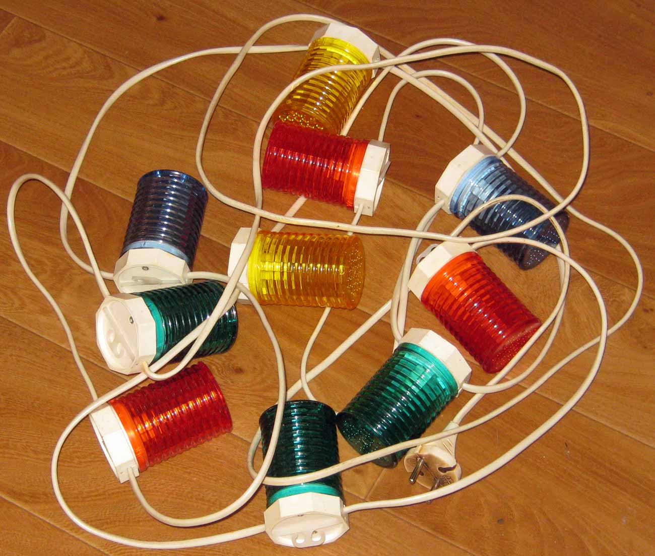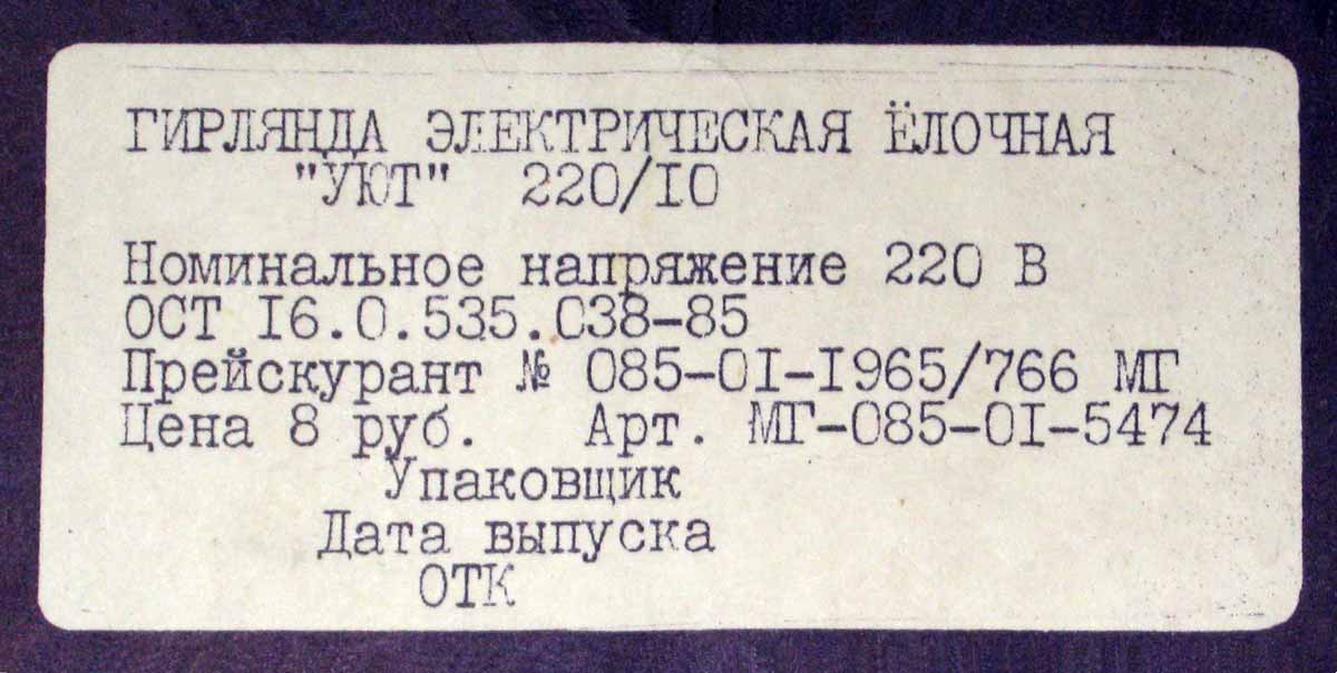 Гирлянда электрическая ёлочная "Уют" выпускалась возможно с 1991 года МПЭК. 220 вольт. 10 ламп МН26-0,12. 4 цвета. Фотографии гирлянды для сайта предоставил Владимир Чащихин, город Пермь.