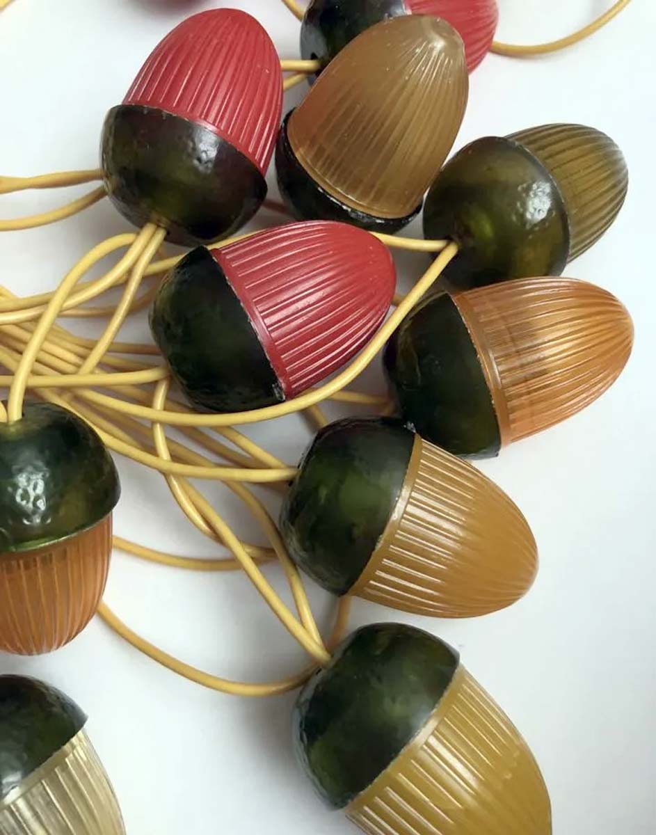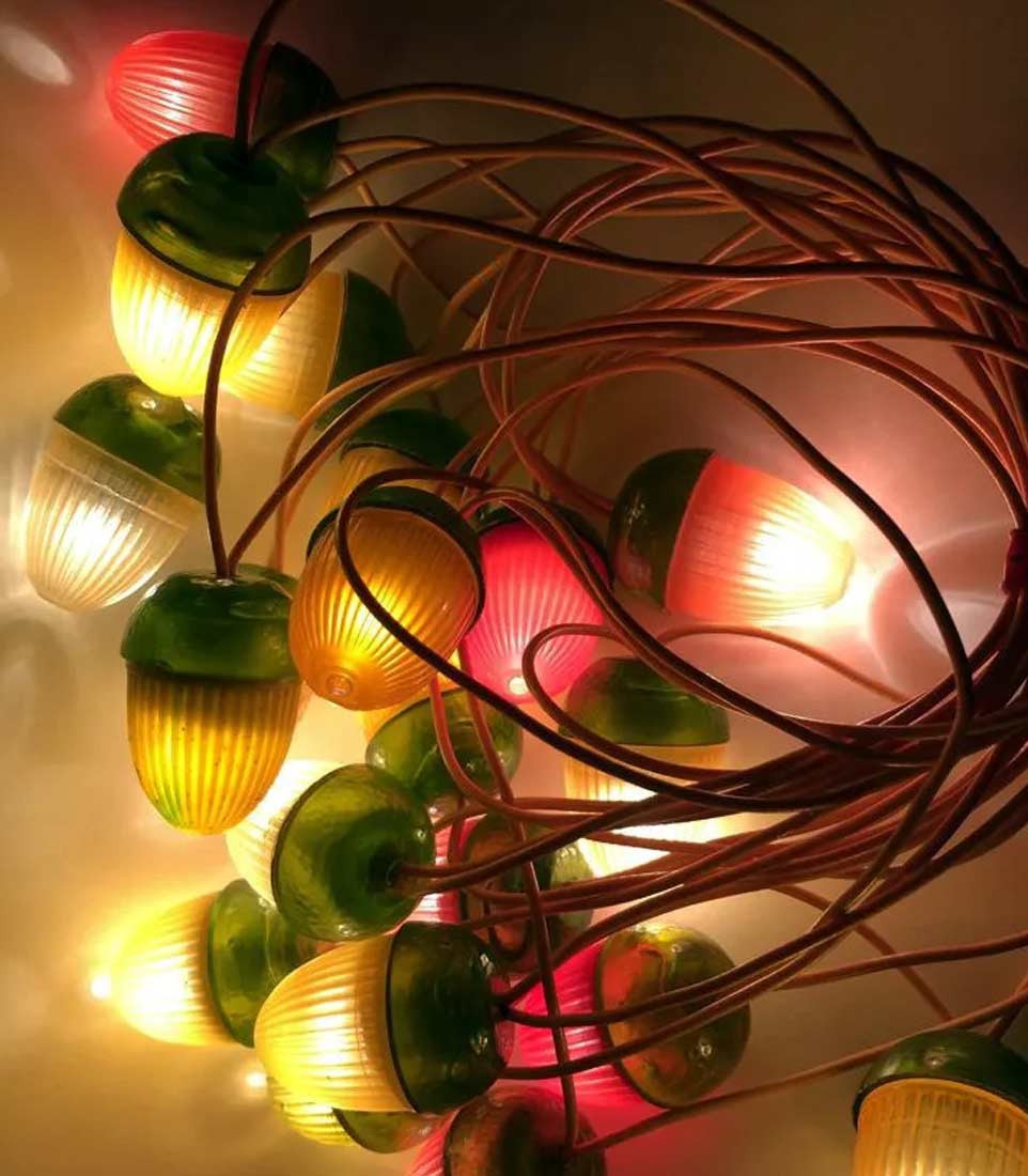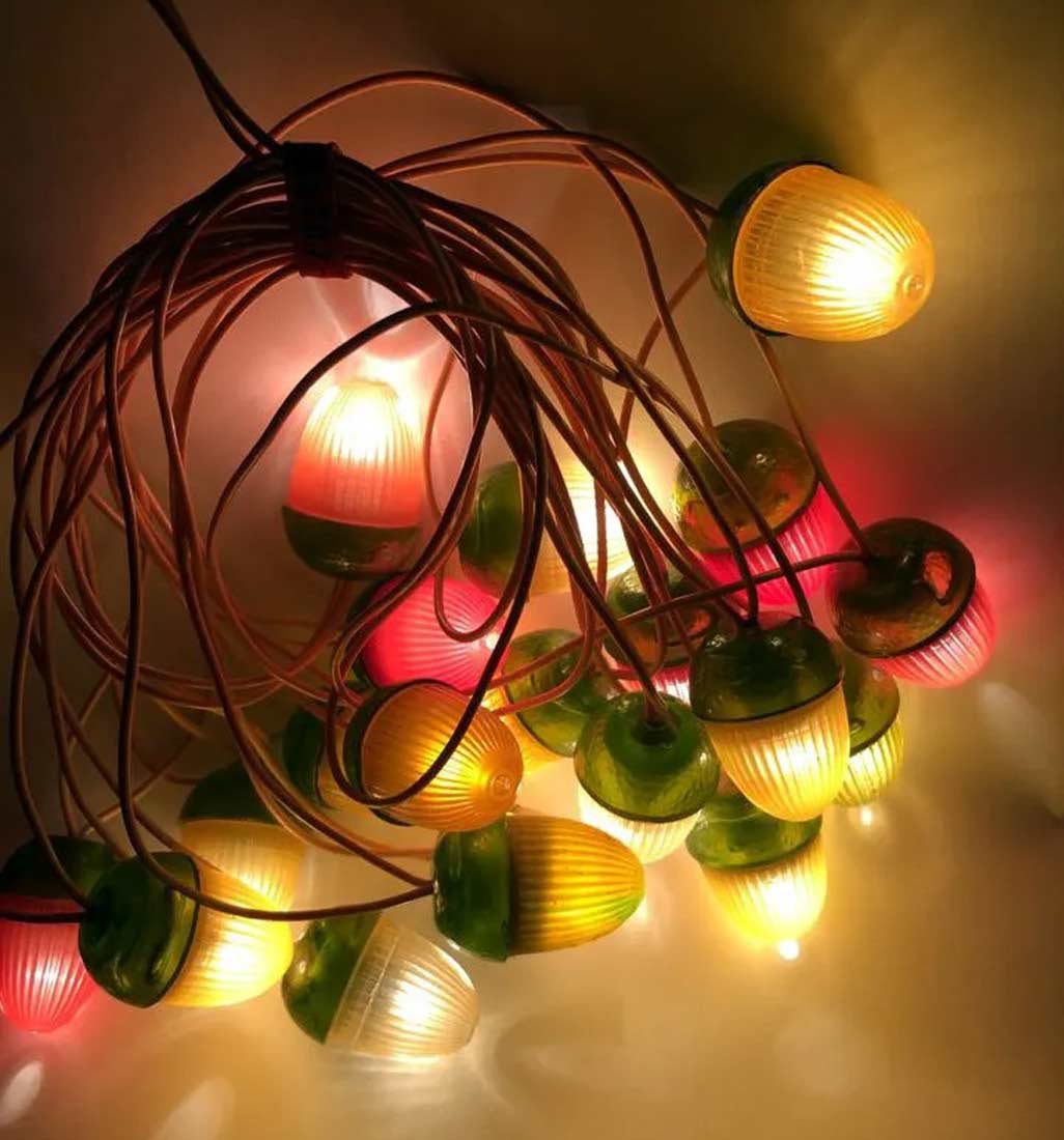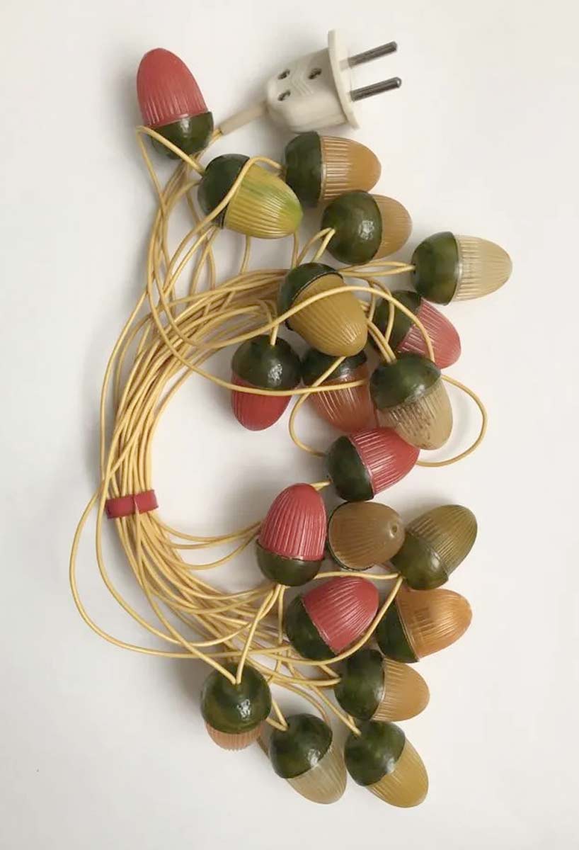 Гирлянда электрическая ёлочная "Жёлудь" производилась предположительно с 1977 года Ереванским электроламповым заводом. Питание от сети 220 вольт. В гирлянде 20 ламп + 2 запасных. Тип Е-13,5 х 0,16.