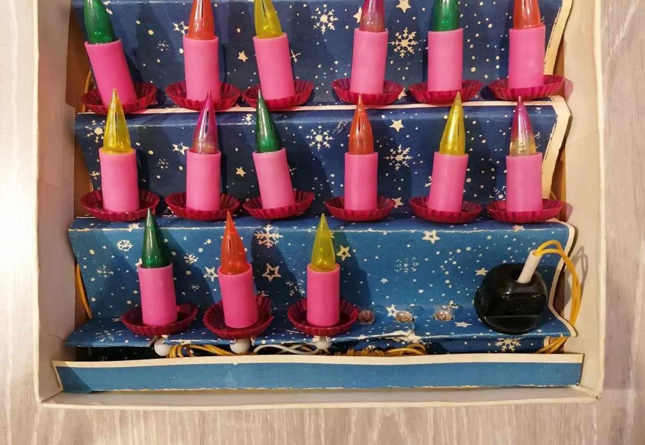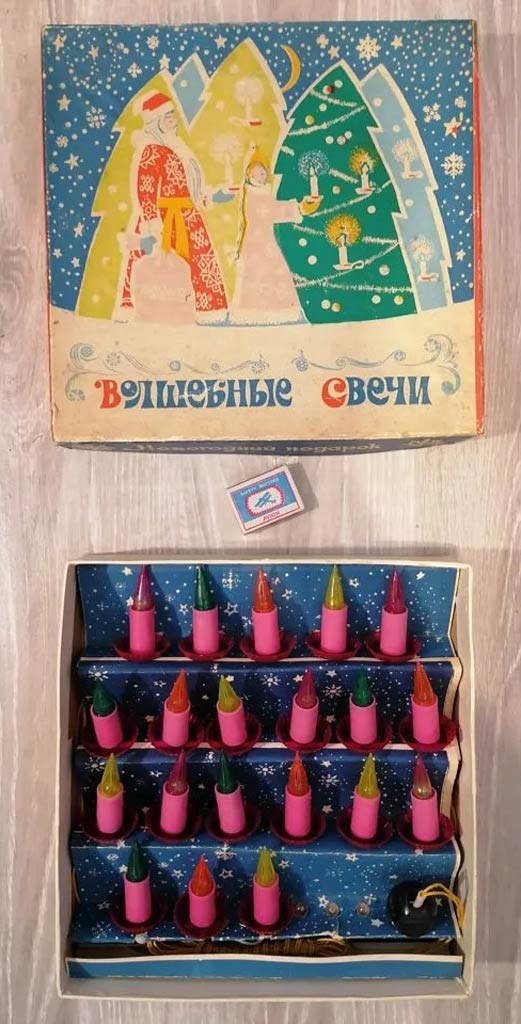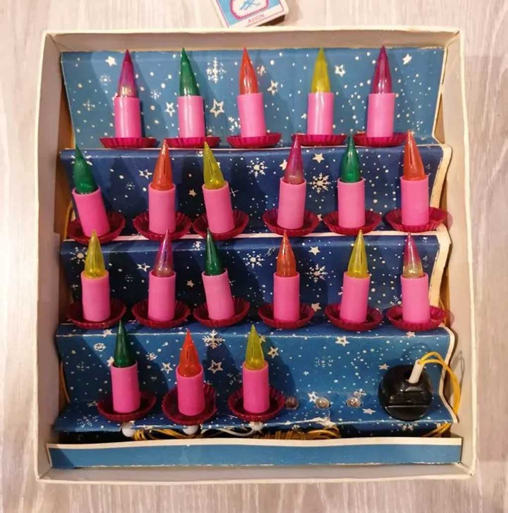 Электрическая ёлочная гирлянда "Волшебные свечи" (Новогодний подарок) производилась предположительно с 1977 года. Изготовитель не установлен. Питание 220 вольт. Лампы Е-13,5 х 0,26 - 20 + 3 запасных.