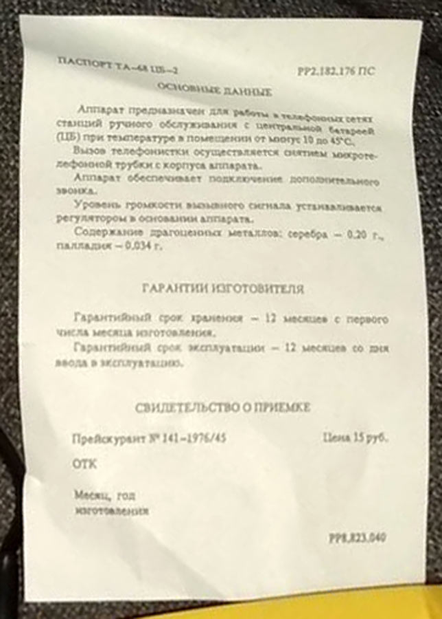 Телефонный аппарат без номеронабирателя "ТА-68ЦБ-2" выпускался с 1968 года Рижским электротехническим заводом "ВЭФ". Служит для работы в сетях станций ручного обслуживания с центральной батареей.