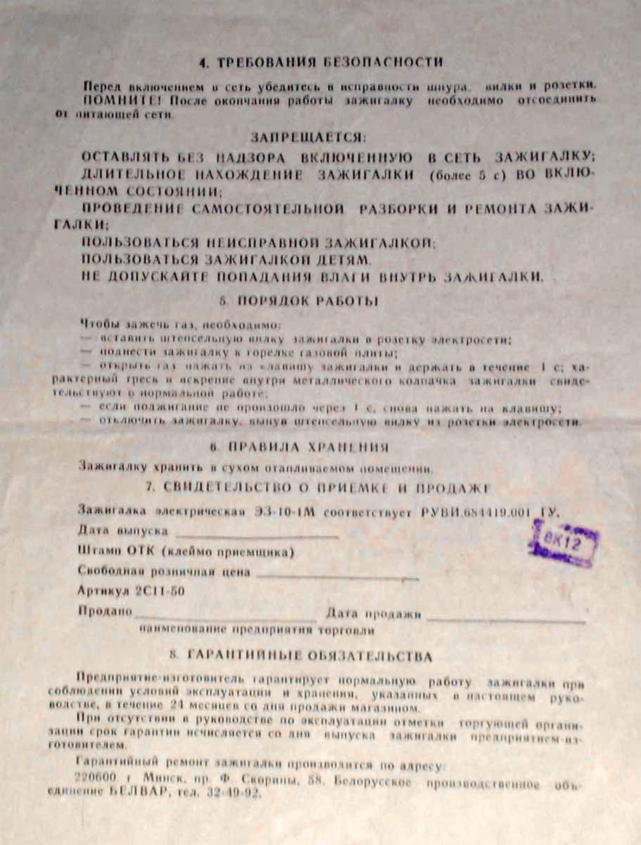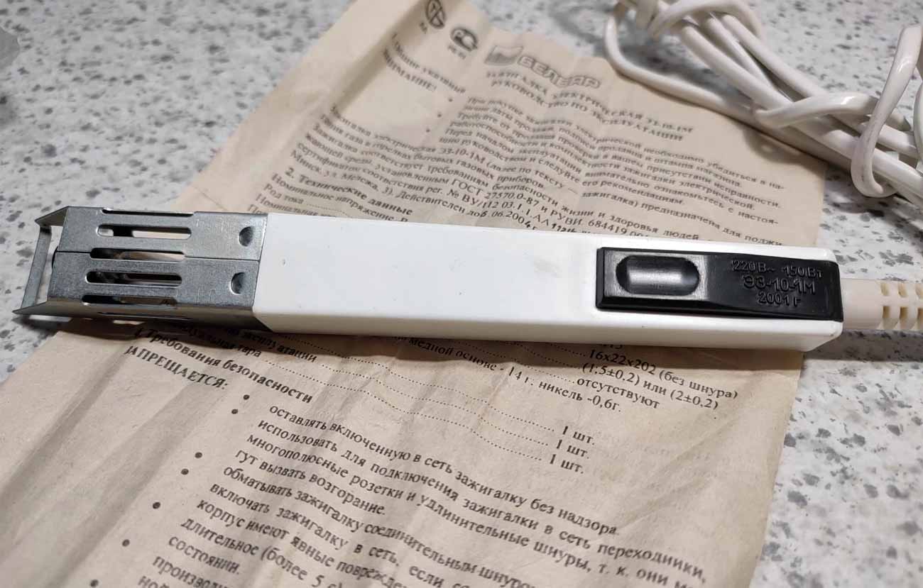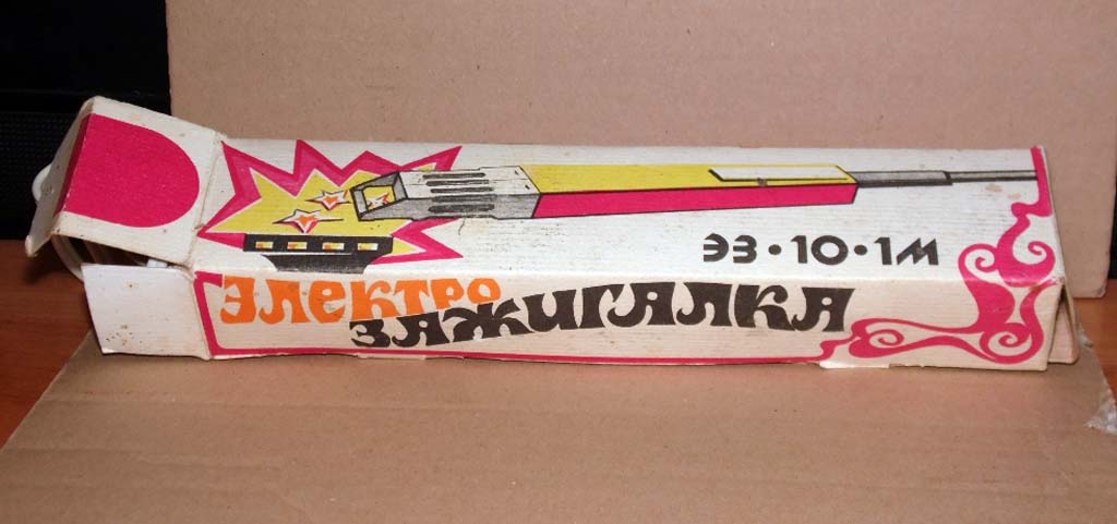 Зажигалка электрическая "ЭЗ-10-1М" выпускалась возможно с 1992 года Белорусским ПО "Белвар". Предназначена для поджигания газа в горелках бытовых газовых приборов.