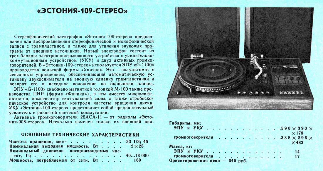 Электрофон "Эстония-109-стерео" в 1980 году опытно выпустил Таллинский завод "Пунане-РЭТ". Реклама в журнале Радио № 7 за 1980 г. 1-е фото предоставил Maciej Tulodziecki, Польша. Остальные с сайта https://retrotexnika.ru/.