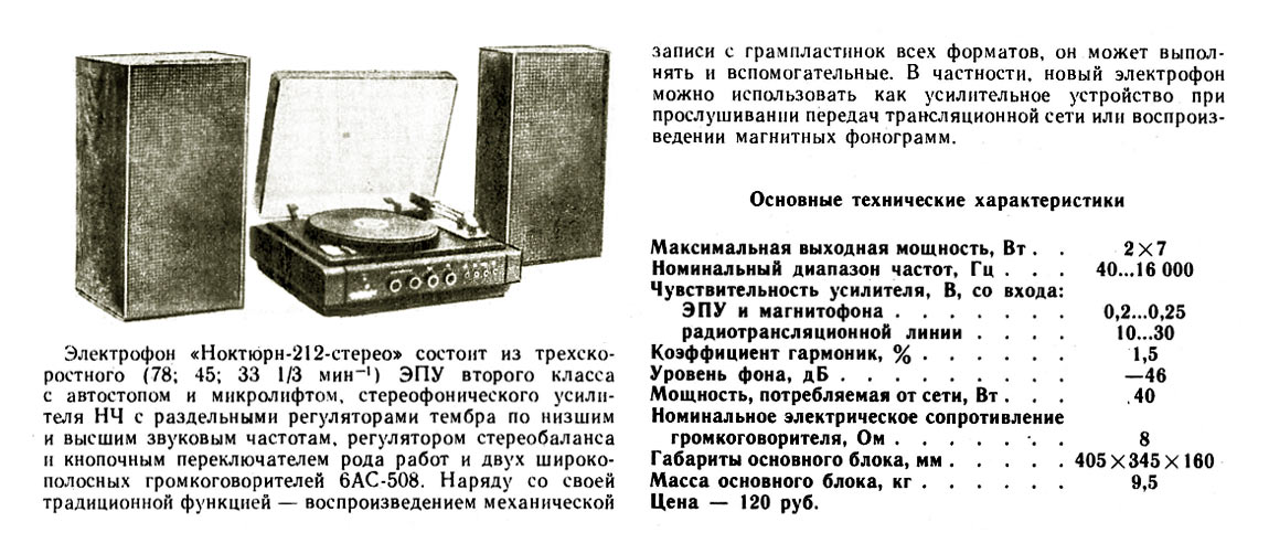 ''Ноктюрн-212 стерео'' состоит из 3-х скоростного 78, 45, 33 об/мин ЭПУ